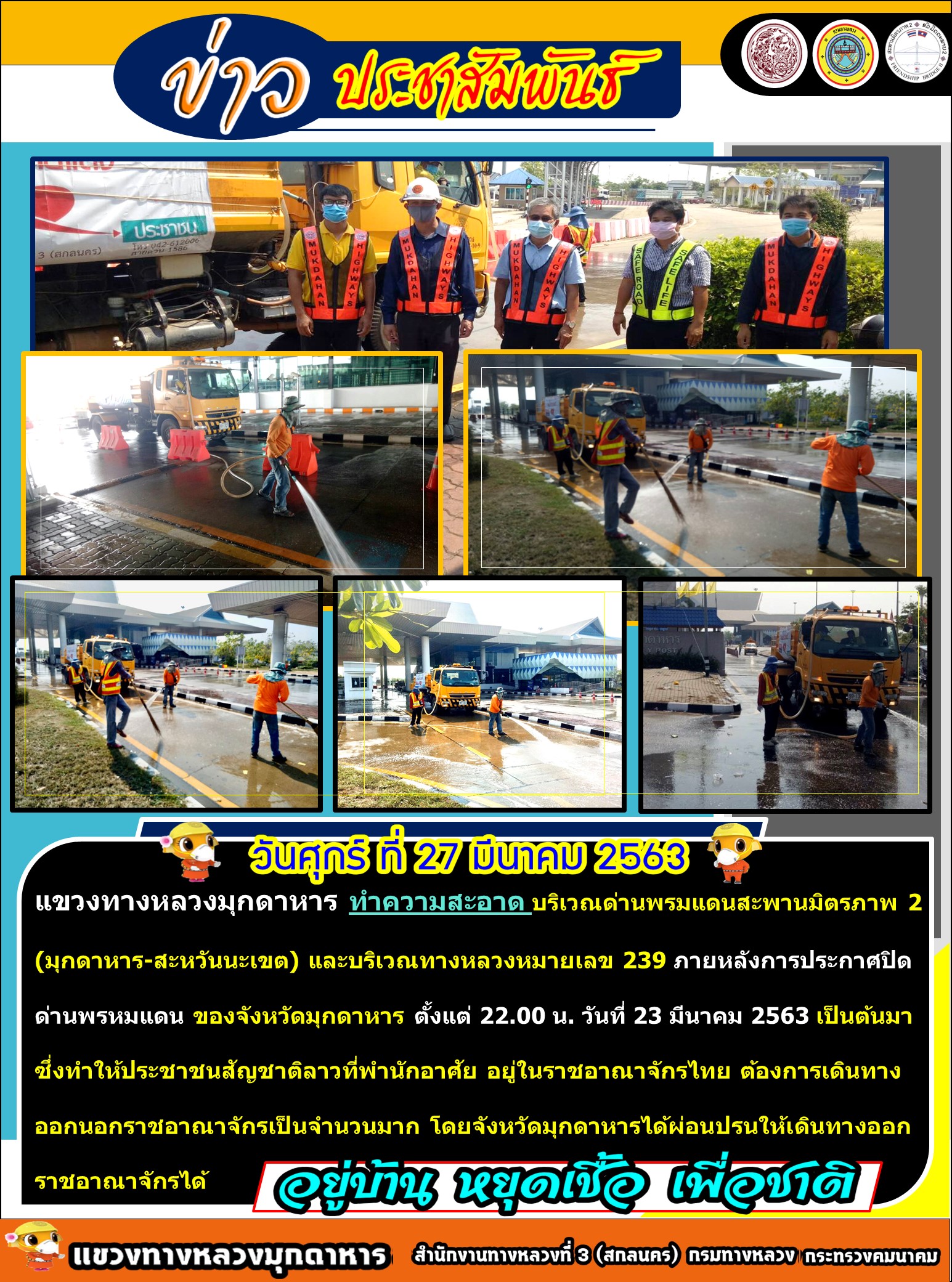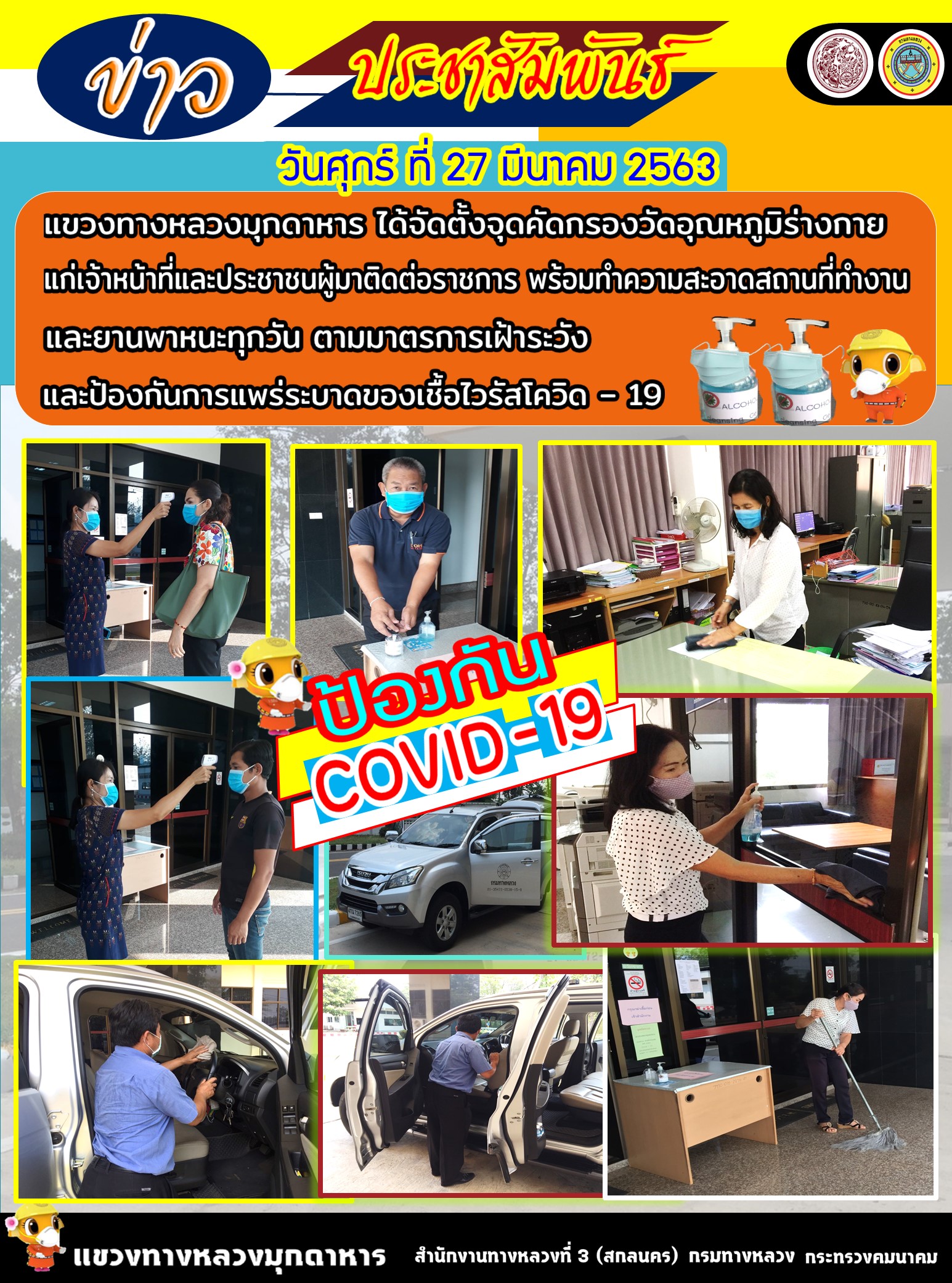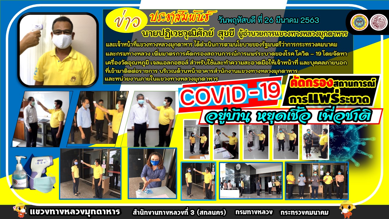 แขวงทางหลวงมุกดาหาร ได้ดำเนินการตามนโยบายของรัฐมนตรีว่าการกระทรวงคมนาคมและกรมทางหลวง เพิ่มมาตรการคัดกรองสถานการณ์การแพร่ระบาดของโรค โควิด – 19
