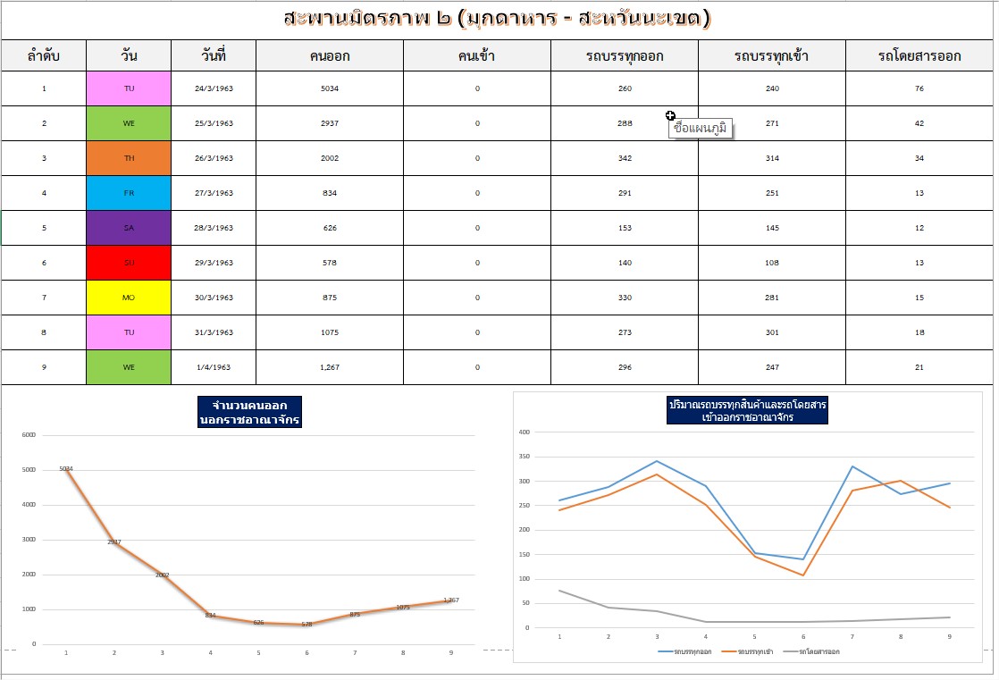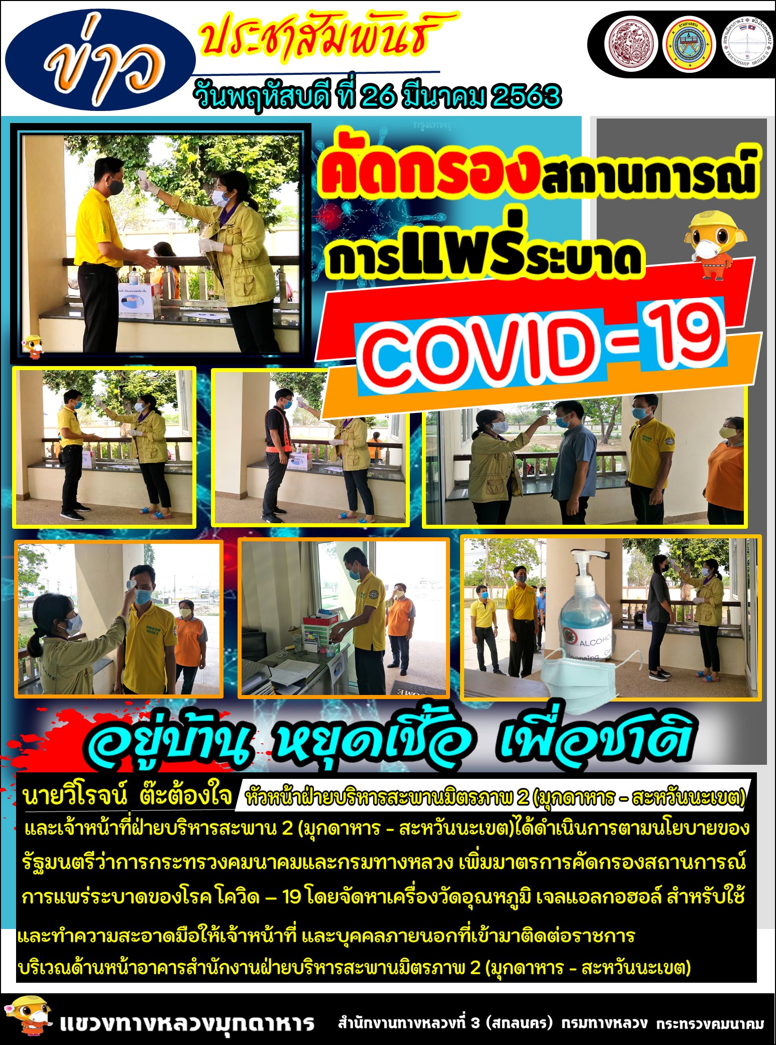 ฝ่ายบริหารสะพาน 2 (มุกดาหาร - สะหวันนะเขต)ได้ดำเนินการตามนโยบายของ รัฐมนตรีว่าการกระทรวงคมนาคมและกรมทางหลวง เพิ่มมาตรการคัดกรองสถานการณ์การแพร่ระบาดของโรค โควิด – 19