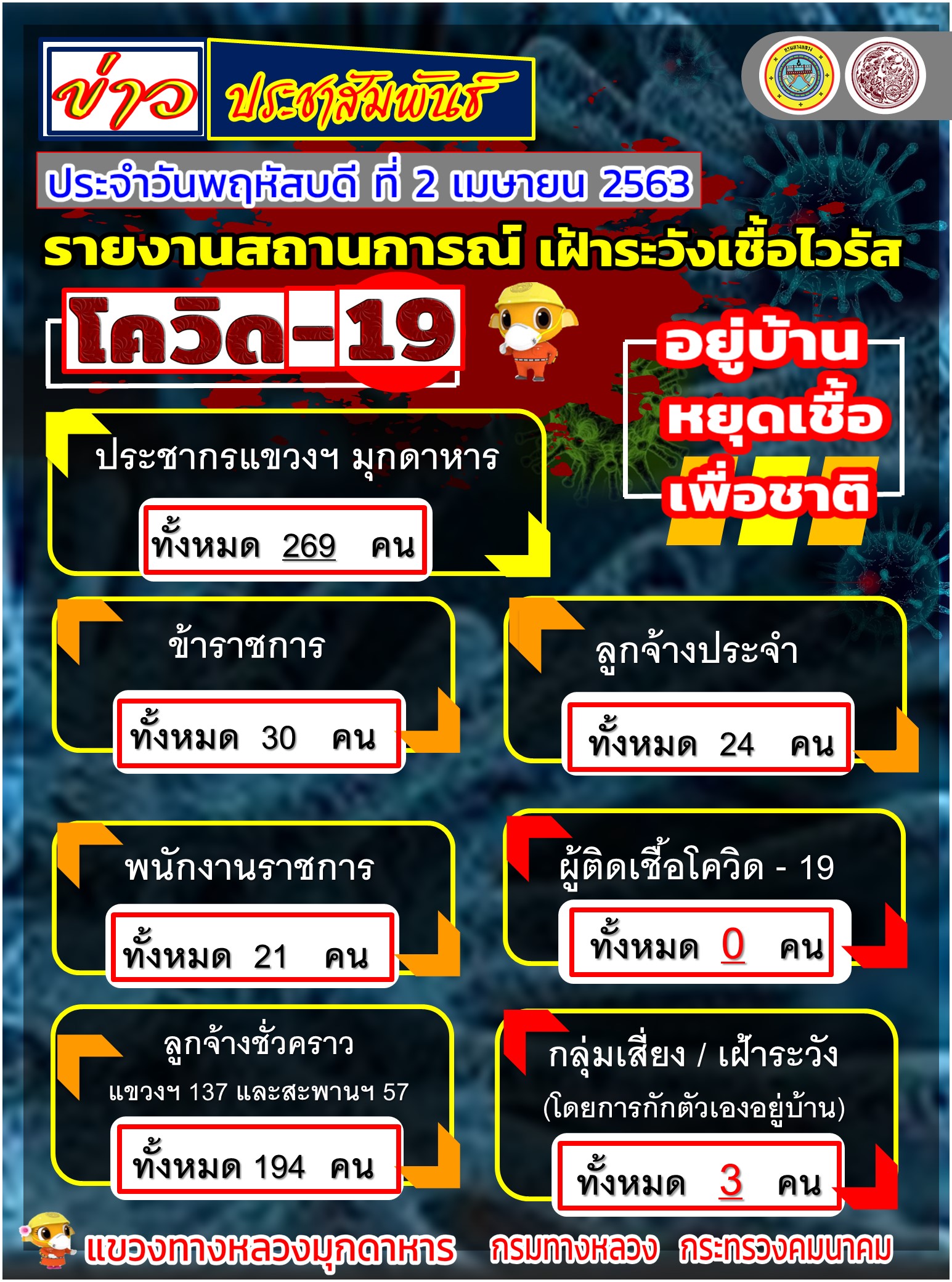 รายงานสถานการณ์เฝ้าระวังเชื้อไวรัสโควิด - 19 .ประจำวันจันทร์ ที่ 30 มีนาคม 2563