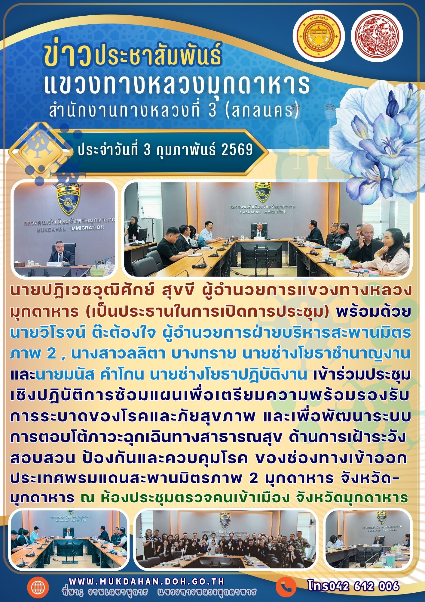 ประชุมเชิงปฏิบัติการซ้อมแผนเพื่อเตรียมความพร้อมรองรับการระบาดของโรคและภัยสุขภาพ และเพื่อพัฒนาระบบการตอบโต้ภาวะฉุกเฉินทางสาธารณสุข ด้านการเฝ้าระวังสอบสวน ป้องกันและควบคุมโรค ของช่องทางเข้าออกประเทศพรมแดนสะพานมิตรภาพ 2 มุกดาหาร