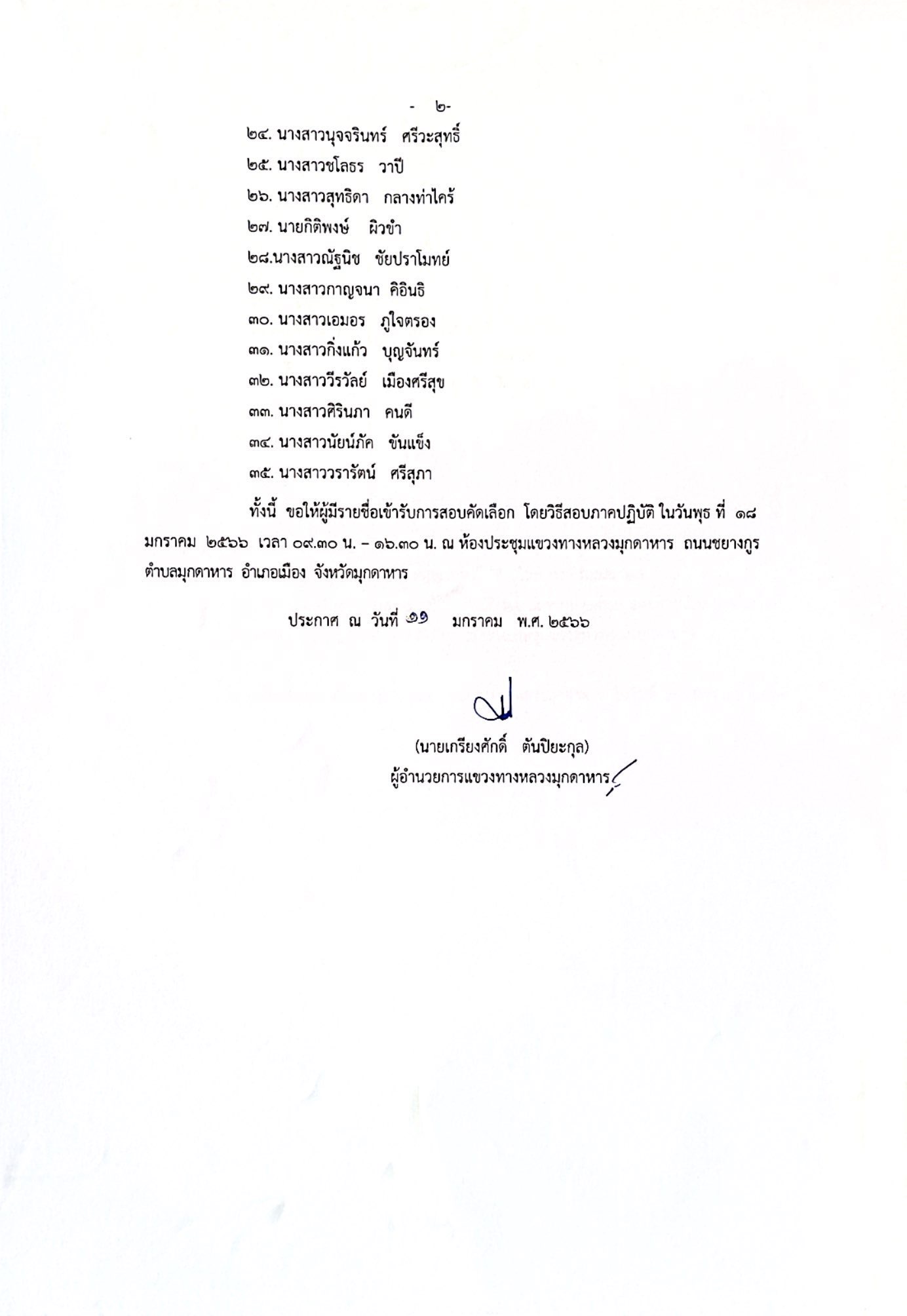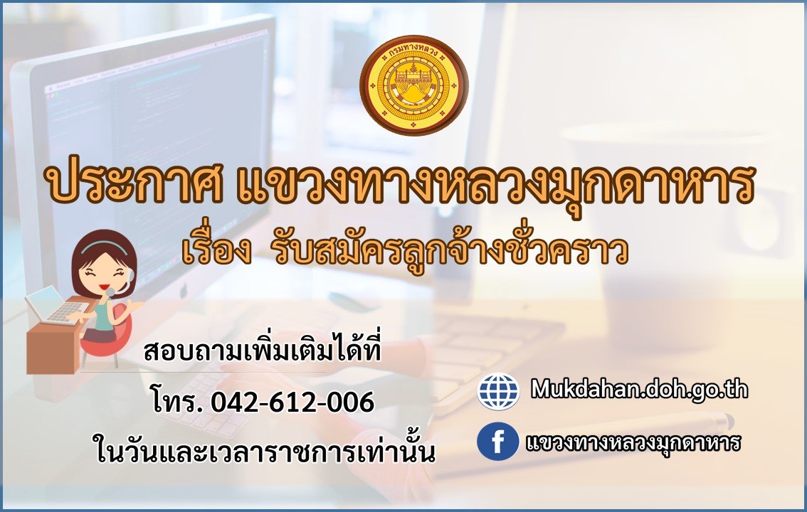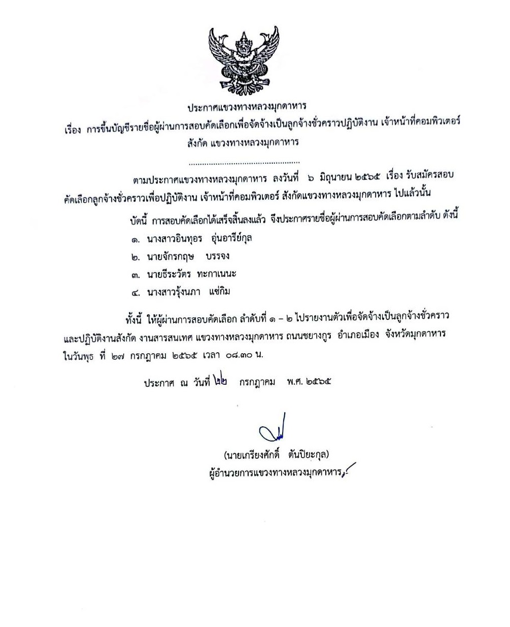 เรื่องประกาศรายชื่อผู้มีสิทธิ์สอบคัดเลือกเพื่อเป็นลูกจ้างชั่วคราว ทำหน้าที่ เจ้าหน้าที่ธุรการ สังกัดแขวงทางหลวงมุกดาหาร