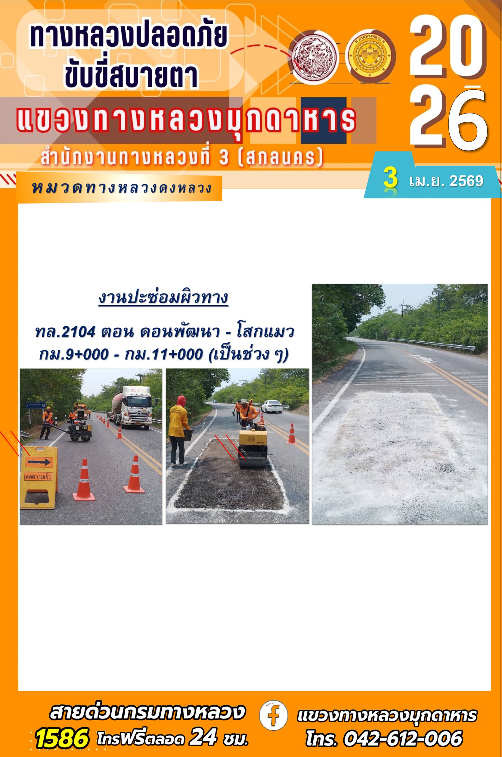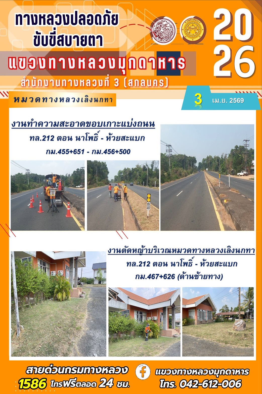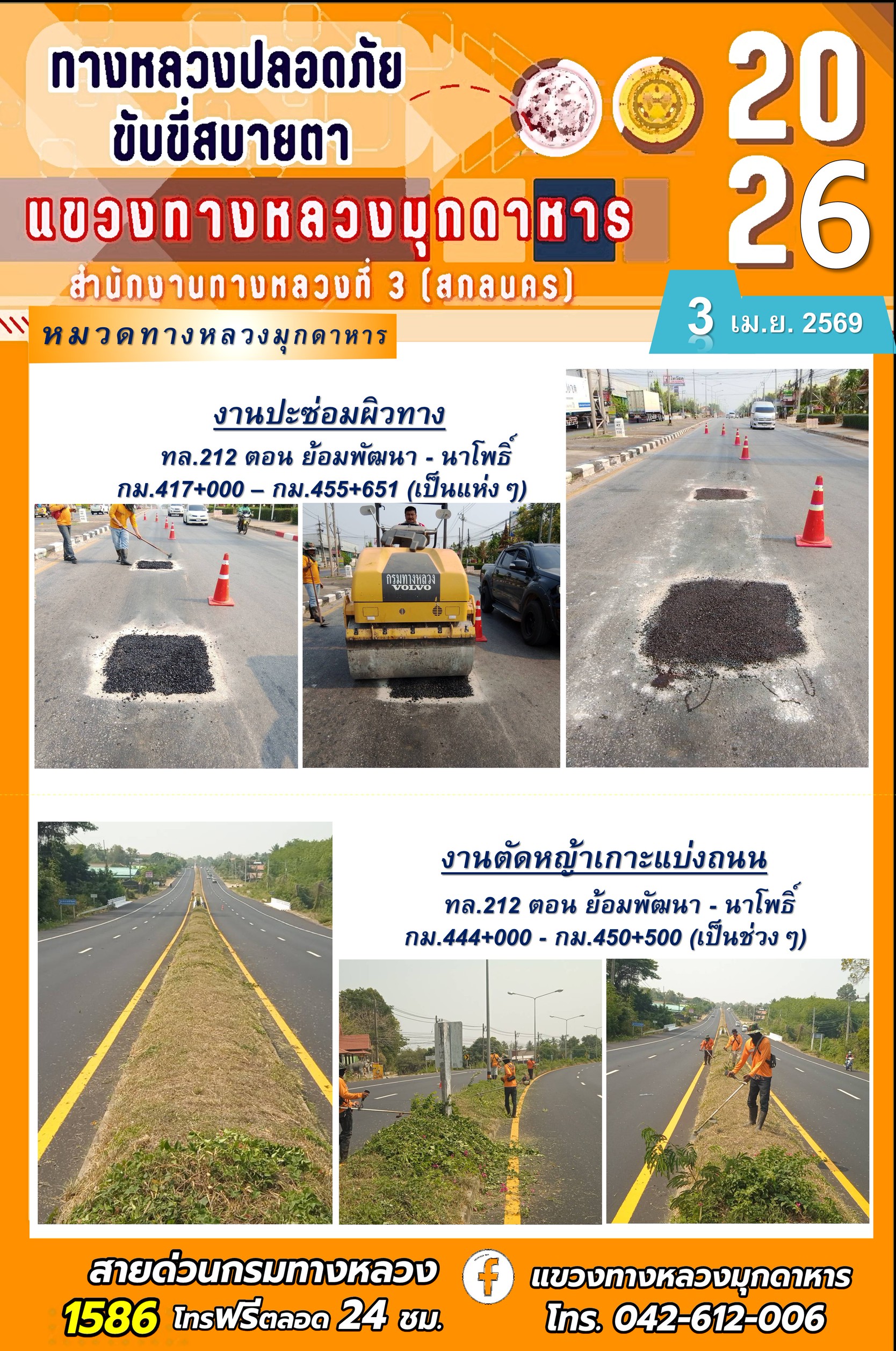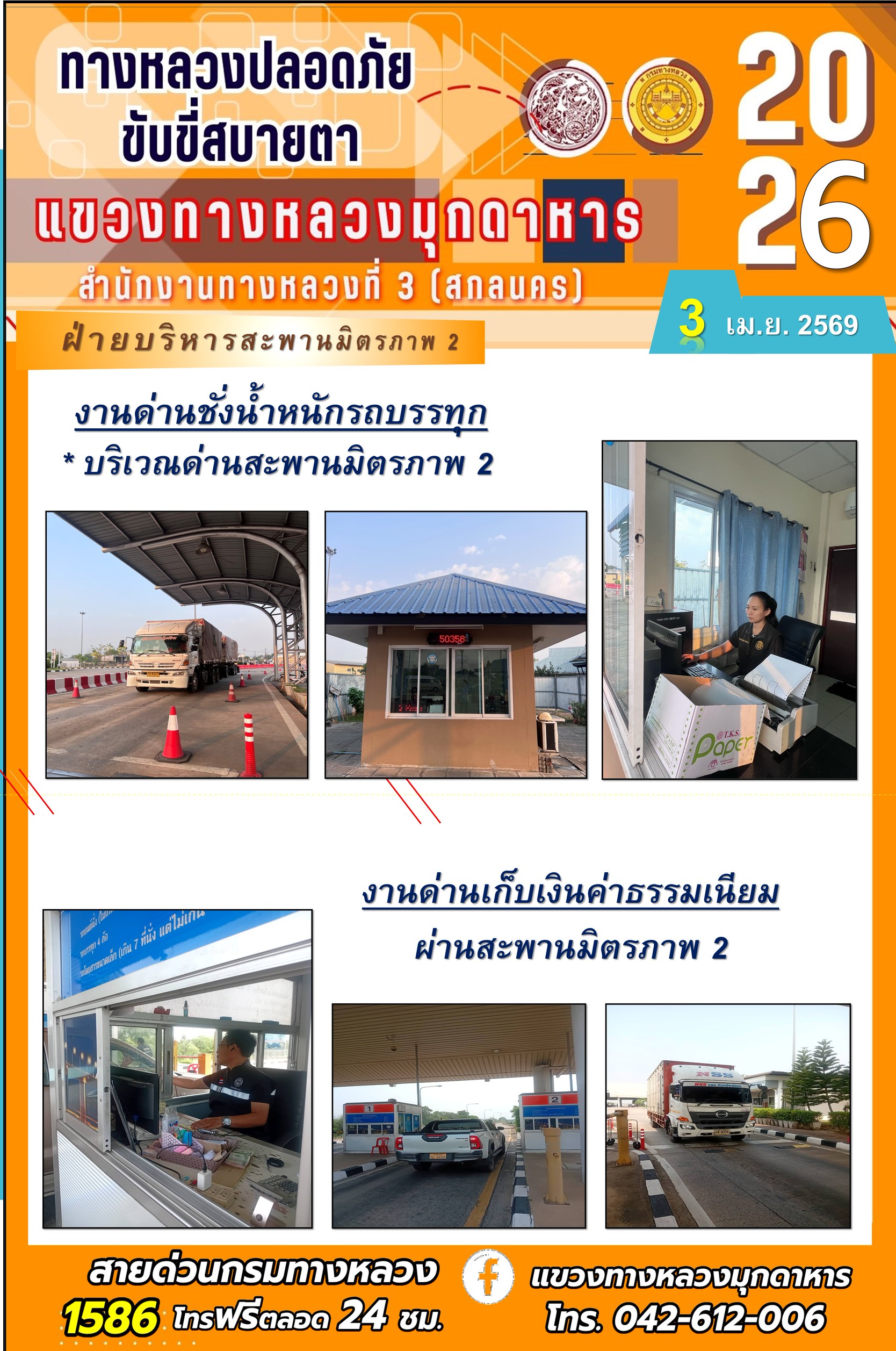 ประจำวันที่ 3 เมษายน 2569 โครงการทางหลวงปลอดภัย ขับขี่สบายตา หน่วยงานในสังกัดแขวงทางหลวง