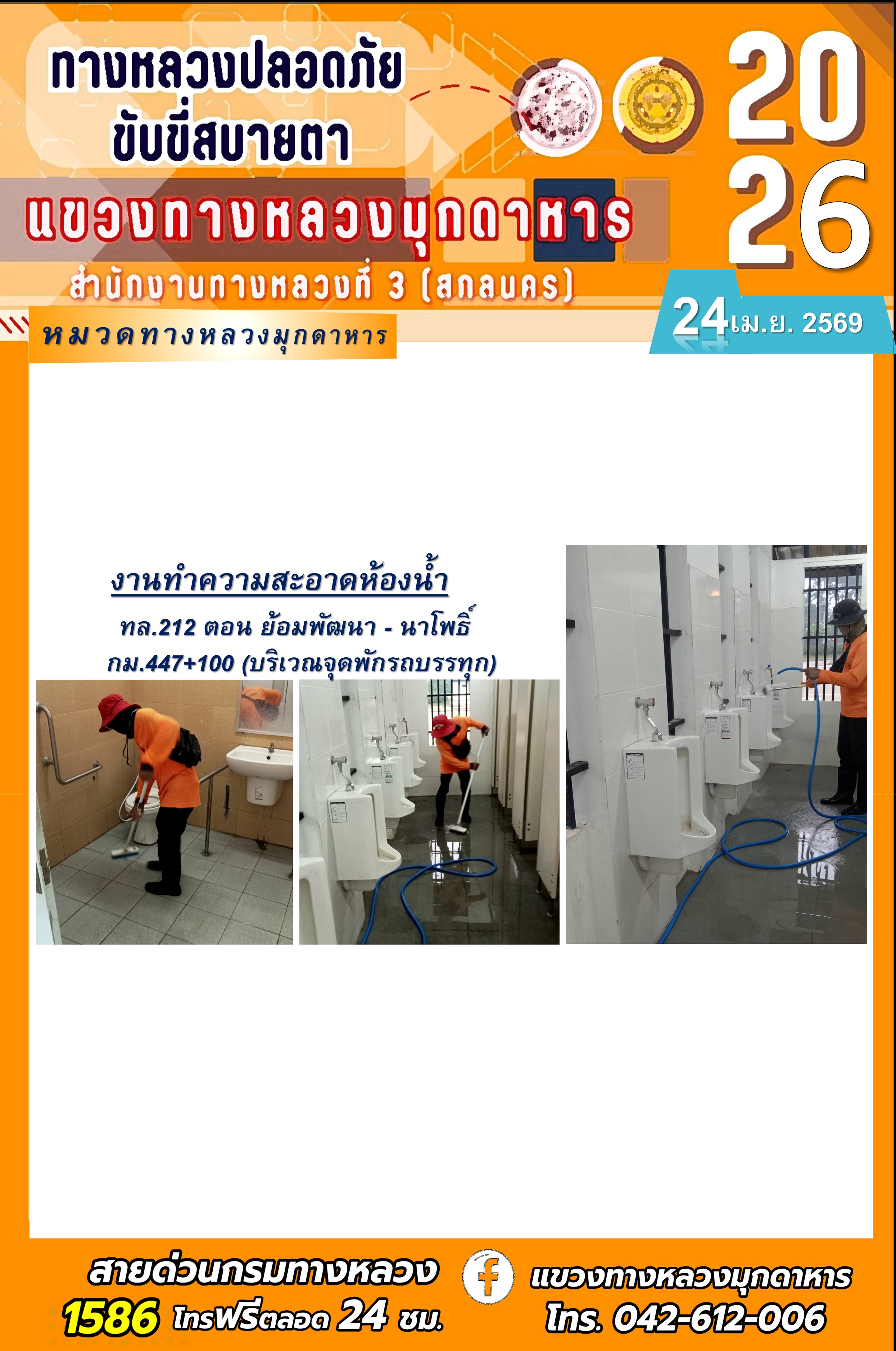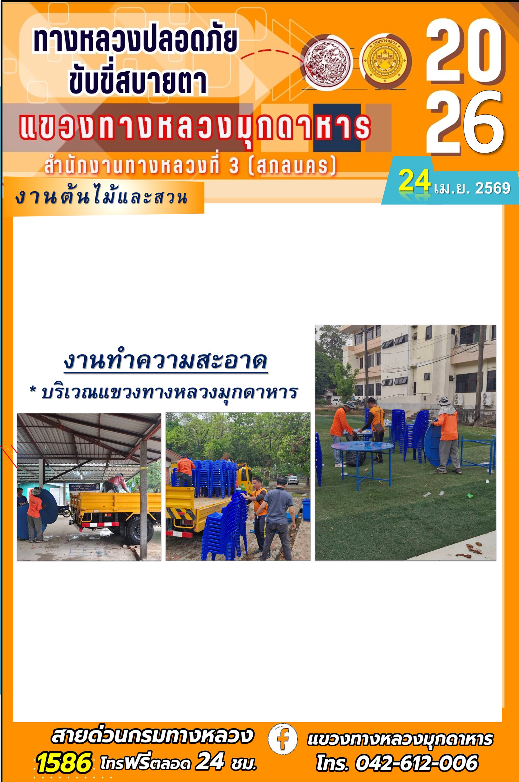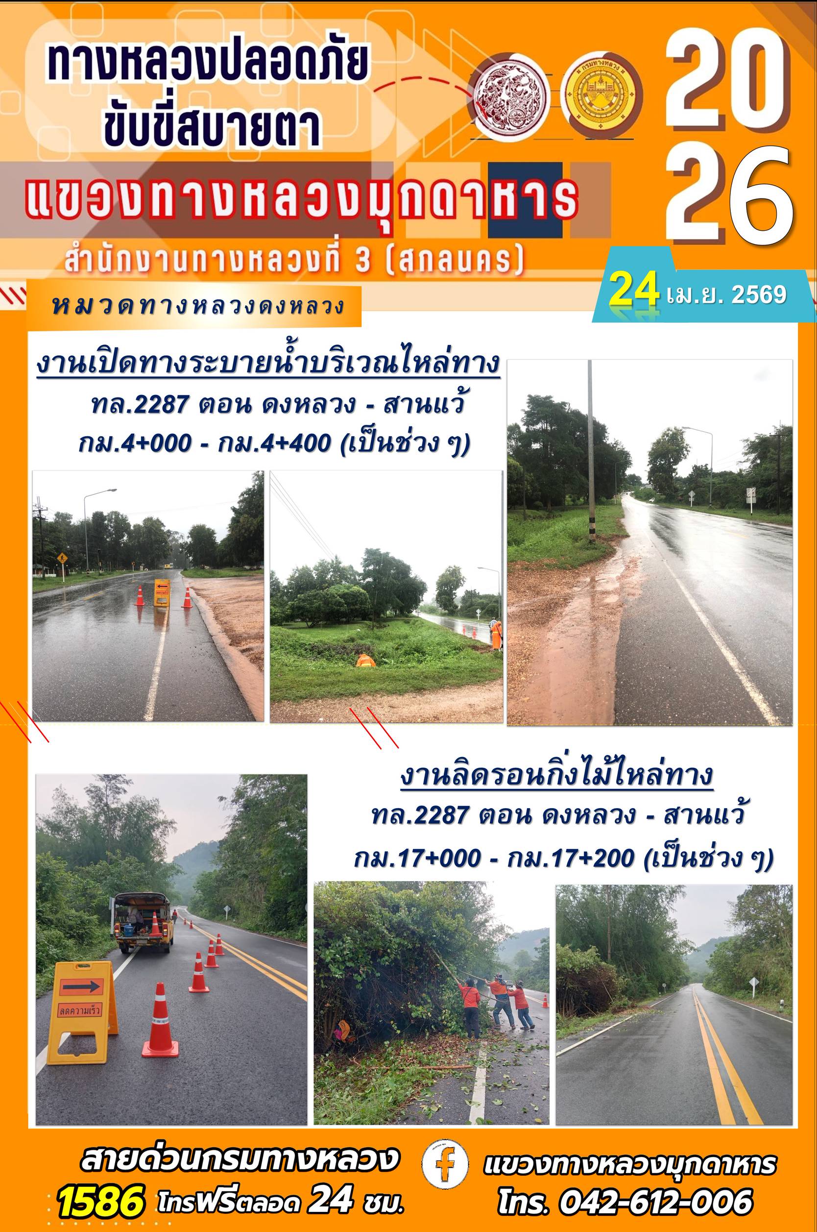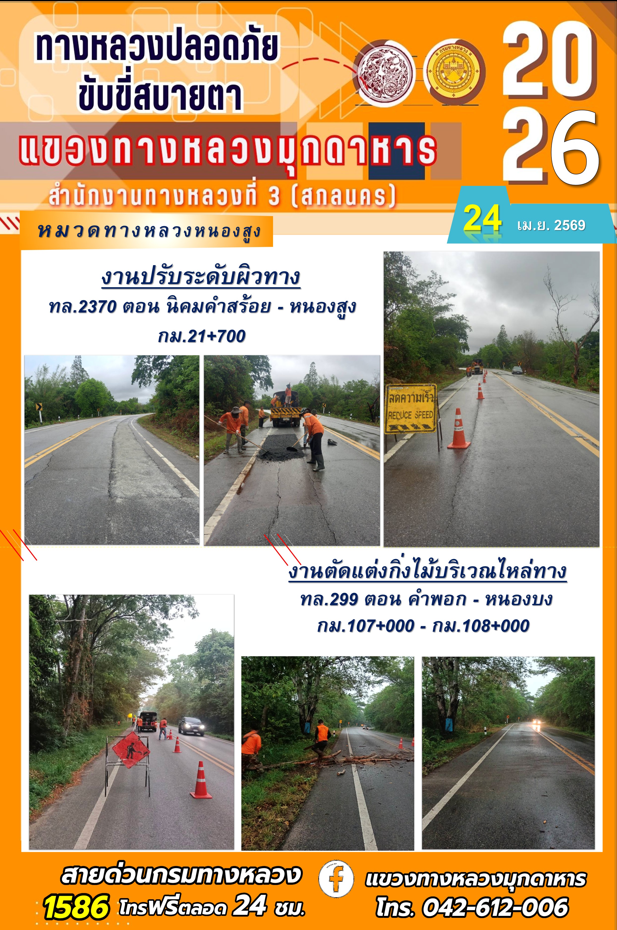 ประจำวันที่ 24 เมษายน 2569 โครงการทางหลวงปลอดภัย ขับขี่สบายตา หน่วยงานในสังกัดแขวงทางหลวง
