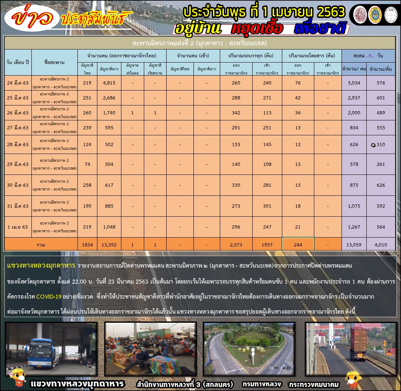 แขวงทางหลวงมุกดาหาร รายงานสถานการณ์ปิดด่านพรหมแดน สะพานมิตรภาพ ๒ (มุกดาหาร - สะหวันนะเขต)