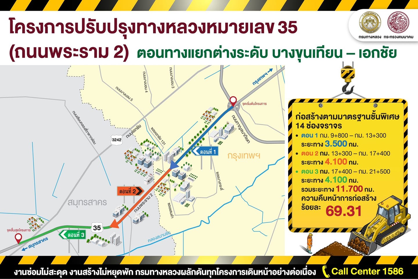 - โครงการปรับปรุงทางหลวงหมายเลข 35 ( ถนนพระราม 2) ตอนทางแยกต่างระดับบางขุนเทียน -เอกชัย ปัจจุบันมีความคืบหน้าร้อยละ 69.31