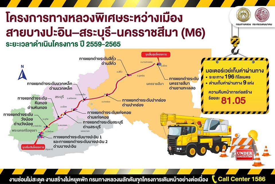 -โครงการทางหลวงพิเศษระหว่างเมือง สายบางปะอิน - สระบุรี - นครราชสีมา(M6) ปัจจุบันมีความคืบหน้าร้อยละ 81. 05