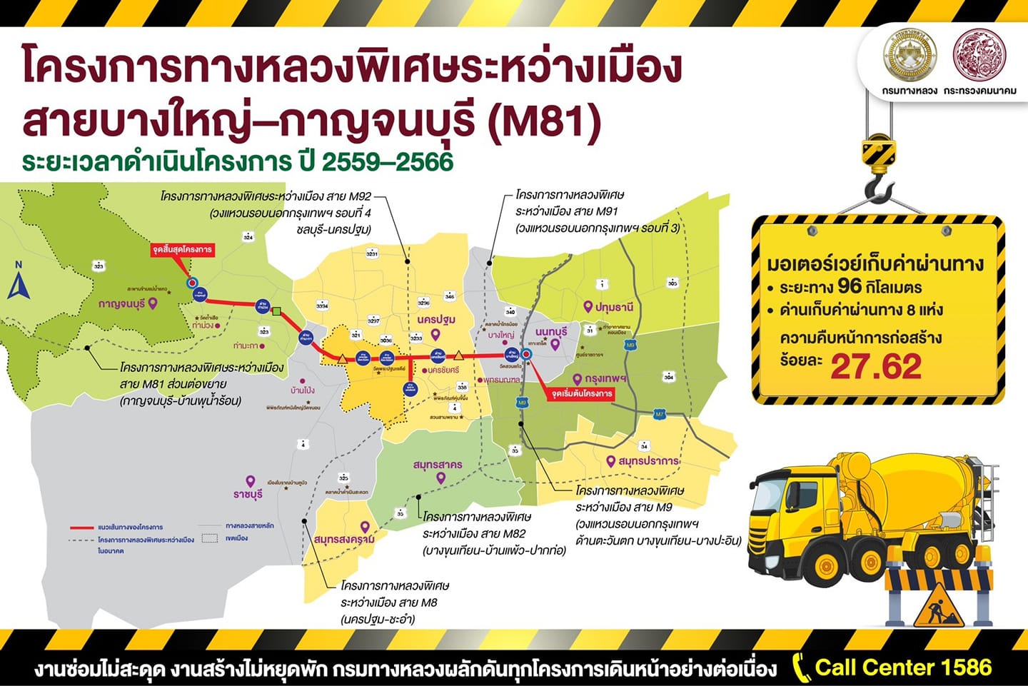 - โครงการทางหลวงพิเศษระหว่างเมือง สายบางใหญ่ - กาญจนบุรี( M81) ความคืบหน้าร้อยละ 27.62