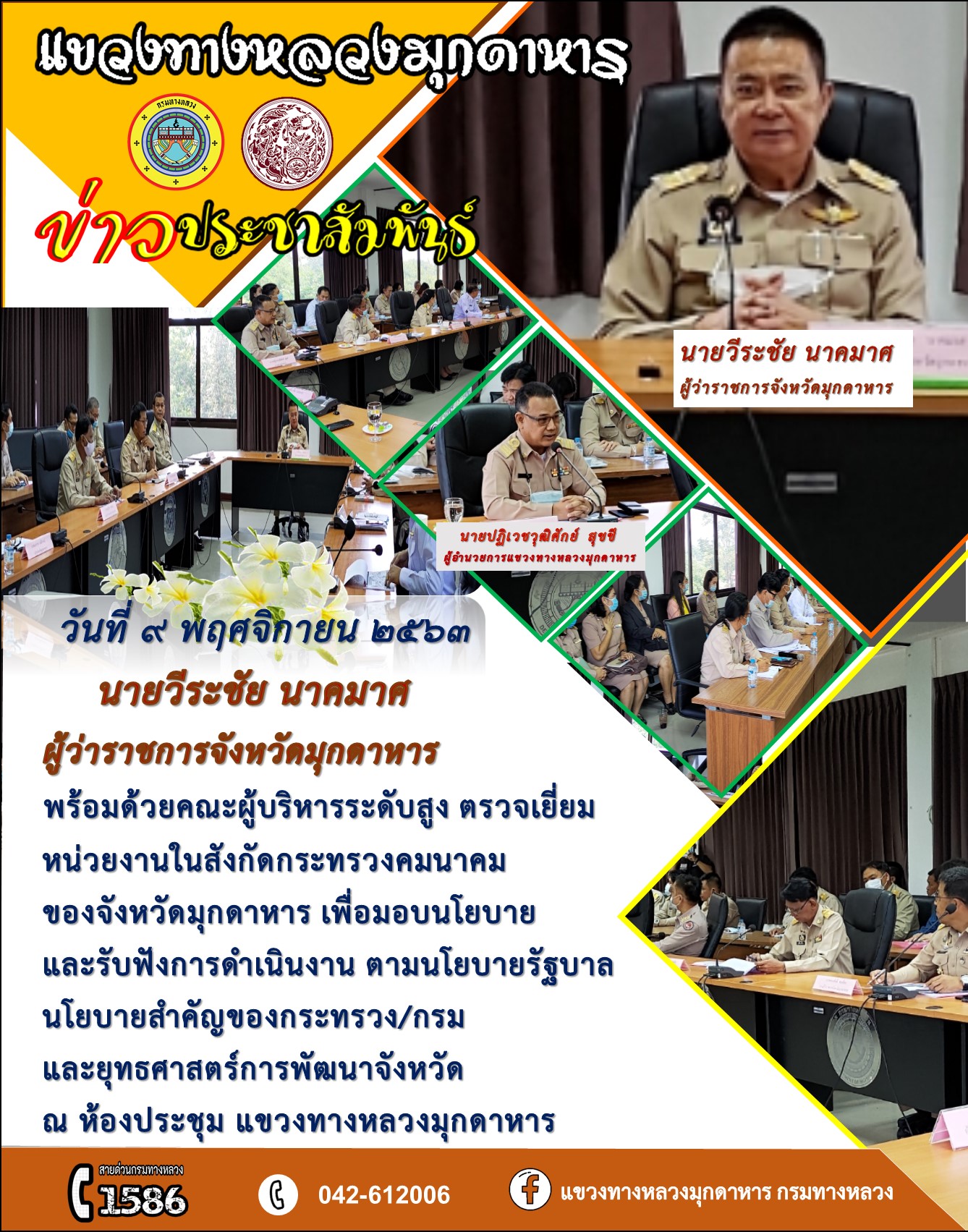 นายวีระชัย นาคมาศ ผู้ว่าราชการจังหวัดมุกดาหาร พร้อมด้วยคณะผู้บริหารระดับสูง ตรวจเยี่ยมหน่วยงานในสังกัดกระทรวงคมนาคมของจังหวัดมุกดาหาร เพื่อมอบนโยบาย และรับฟังการดำเนินงาน ตามนโยบายรัฐบาล นโยบายสำคัญของกระทรวง/กรม และยุทธศาสตร์การพัฒนาจังหวัด ณ ห้องประชุม แขวงทางหลวงมุกดาหาร