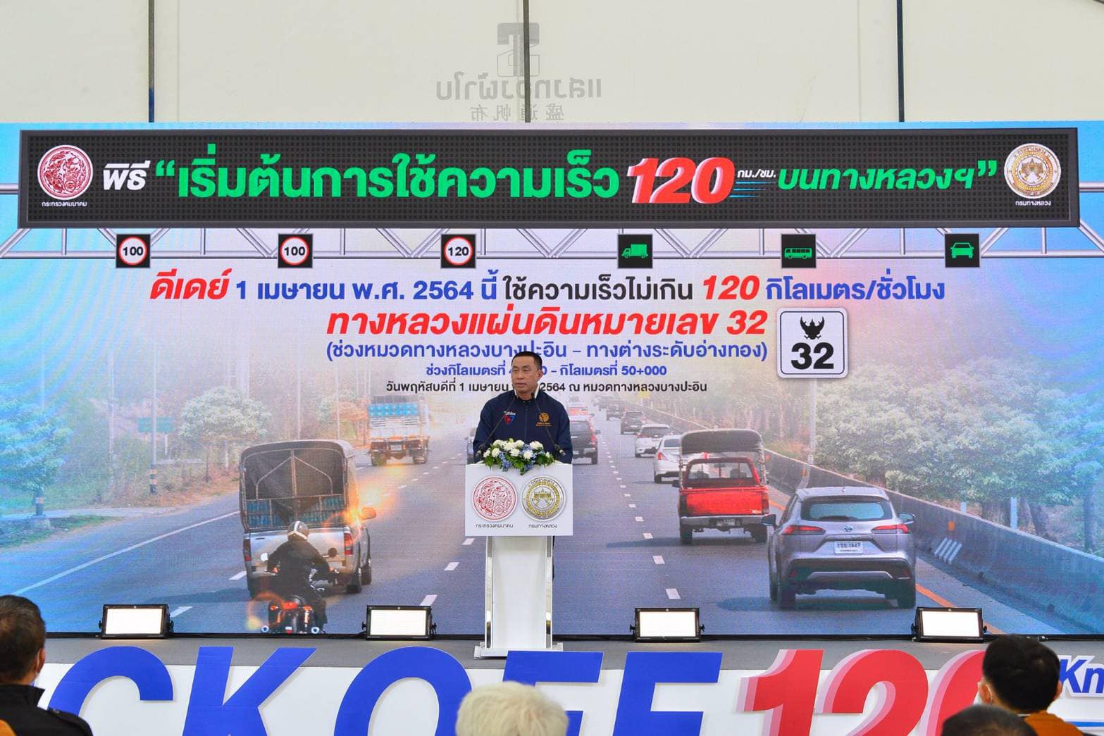 นายศักดิ์สยาม ชิดชอบ รัฐมนตรีว่าการกระทรวงคมนาคม กล่าวว่า ตั้งแต่เข้ามารับตำแหน่ง ในฐานะรัฐมนตรีว่าการกระทรวงคมนาคม ได้มอบนโยบายการปรับเพิ่มอัตราความเร็วของรถยนต์ จากความเร็วไม่เกิน 90 กิโลเมตรต่อชั่วโมง เป็นความเร็วไม่เกิน 120 กิโลเมตรต่อชั่วโมง เฉพาะถนนที่ได้มาตรฐานตามที่กฎกระทรวงกำหนด มีช่องจราจรตั้งแต่ 4 ช่องขึ้นไป ไม่มีจุดกลับรถระดับราบ มีเกาะกลางถนนแบบกำแพงกั้น และมีความปลอดภัยด้านวิศวกรรมสูง โดยที่ผ่านมากระทรวงคมนาคมได้เตรียมการนโยบายนี้มาอย่างต่อเนื่อง จนเป็นผลสำเร็จ และประกาศกฎกระทรวงกำหนดอัตราความเร็วฉบับใหม่ในราชกิจจานุเบกษา เมื่อวันที่ 10 มีนาคม 2564 ที่ผ่านมา โดยเส้นทางแรกที่ถือเป็นจุดเริ่มต้นในการใช้ความเร็ว 120 กิโลเมตรต่อชั่วโมง คือ ทางหลวงหมายเลข 32 หรือถนนสายเอเชีย ช่วงหมวดทางหลวงบางปะอิน ถึง ทางต่างระดับอ่างทอง เพื่อให้ผู้ขับขี่ได้ใช้อัตราความเร็วตามที่กฎหมายกำหนด ได้อย่างสะดวก รวดเร็ว ที่สำคัญคือ มีความปลอดภัยสูง โดยกระทรวงคมนาคมยังได้สั่งการและเน้นย้ำให้กรมทางหลวงปรับปรุงเพิ่มมาตรฐานทางกายภาพให้เกิดความสะดวกและปลอดภัยมากยิ่งขึ้น ได้แก่ เสริมการก่อสร้างอุปกรณ์ป้องกันด้านข้างทาง (Concrete Barrier) เพื่อช่วยลดความเสี่ยงของการเกิดอุบัติเหตุรุนแรงเนื่องจากการเสียหลักตกเกาะกลาง ปรับปรุงจุดกลับรถระดับราบ เพื่อลดการตัดกันของกระแสจราจร ติดตั้งป้ายจราจรและป้ายเปลี่ยนข้อความได้เพื่อสื่อสารการใช้ความเร็วที่เหมาะสมในแต่ละช่องจราจร รวมทั้งติดตั้งแถบเตือน Rumble Strips เพื่อแจ้งจุดเริ่มต้นและจุดสิ้นสุดการเข้าเขตควบคุมความเร็ว โดยเส้นทางนี้ ถือเป็น “ต้นแบบ” ของทางหลวงแผ่นดินและทางหลวงชนบท โดยกรมทางหลวงมีแผนจะประกาศใช้สายทางในระยะที่ 2 ภายในเดือนสิงหาคม 2564 นี้ ครอบคลุมเส้นทางในภาคกลาง ภาคเหนือ ภาคตะวันออกเฉียงเหนือ และภาคใต้ ระยะทางประมาณ 260 กิโลเมตร เช่น ทางหลวงหมายเลข 32 ช่วง อ่างทอง - สิงหบุรี ทางหลวงหมายเลข 1 ช่วงหางน้ำหนองแขม - นครสวรรค์ ทางหลวงหมายเลข 2 ตอนบ่อทอง-มอจะบก และทางหลวงหมายเลข 4 ช่วง เขาวัง-สระพระ เป็นต้น พร้อมทั้งดำเนินการต่อเนื่องเพิ่มเติมบนทางหลวงสายหลัก เช่น ทางหลวงหมายเลข 1 พหลโยธิน ทางหลวงหมายเลข 2 มิตรภาพ ทางหลวงหมายเลข 24 สีคิ้ว-อุบลราชธานี ทางหลวงหมายเลข 340 บางบัวทอง -สุพรรณบุรี และทางหลวงหมายเลข 44 กระบี่-ขนอม อีกประมาณ 1,760 กิโลเมตร ตั้งแต่เดือนธันวาคม 2564 เป็นต้นไป
