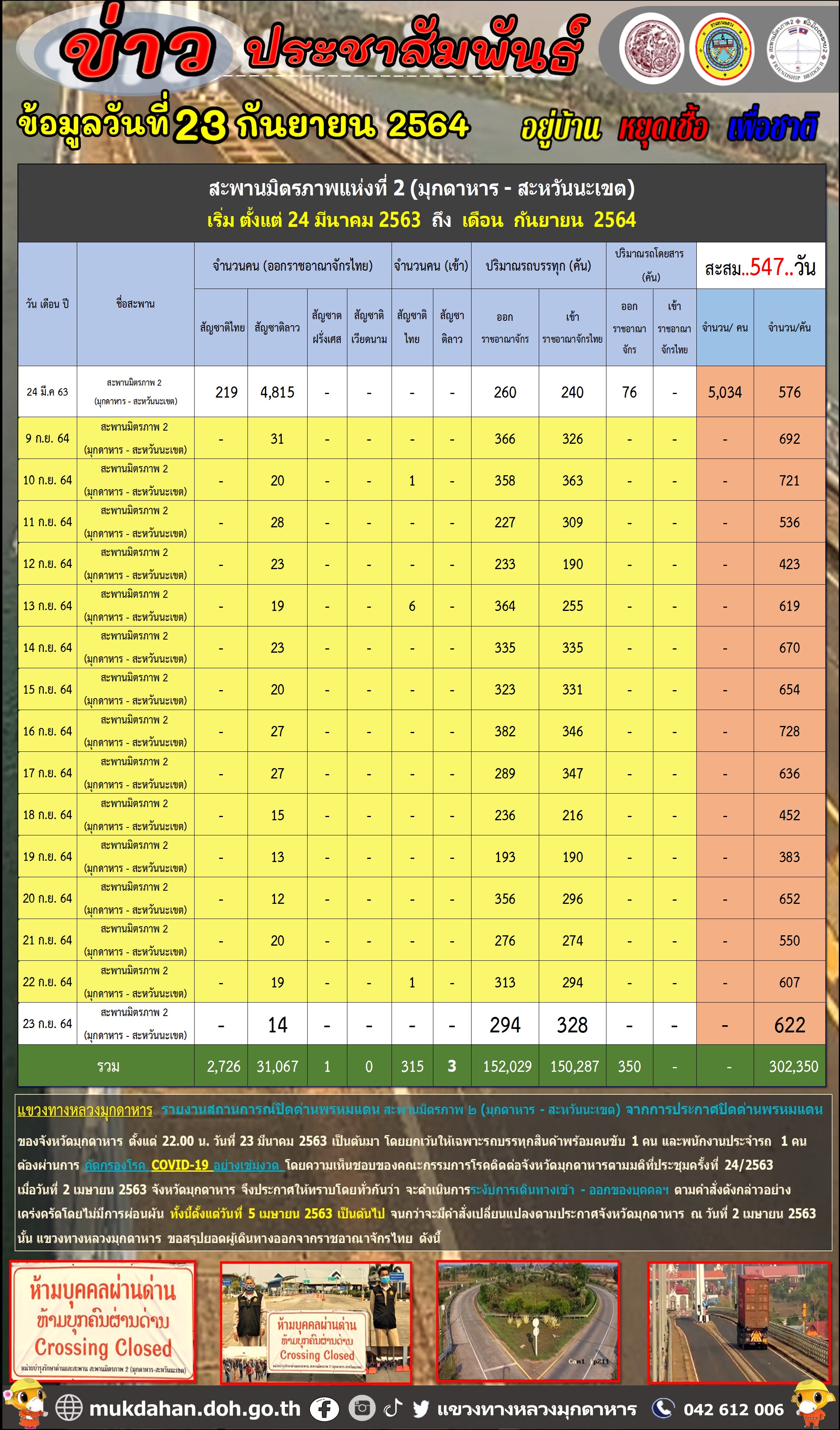 ข้อมูลข่าว : รายงานสถานการณ์ปิดด่านพรมแดน สะพานมิตรภาพ ๒ วันที่ .23.9.64