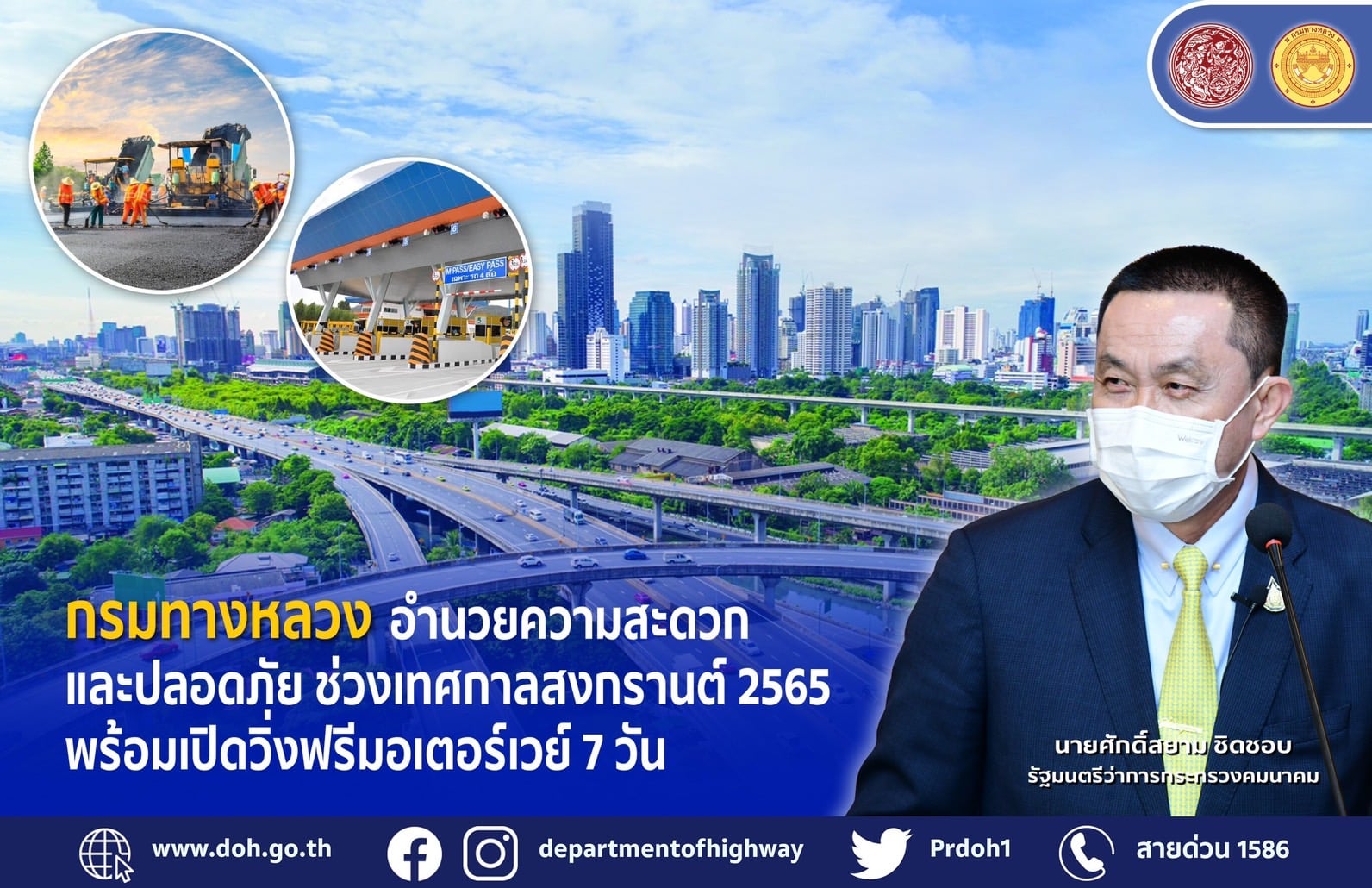 กรมทางหลวงอำนวยความสะดวกและปลอดภัยช่วงเทศกาลสงกรานต์ 2565 พร้อมเปิด วิ่งฟรีมอเตอร์เวย์ 7 วัน เพื่อรองรับการเดินทางของประชาชนสู่ภูมิภาคต่าง ๆ