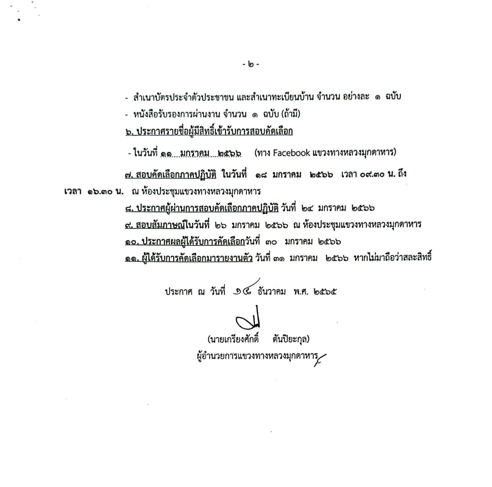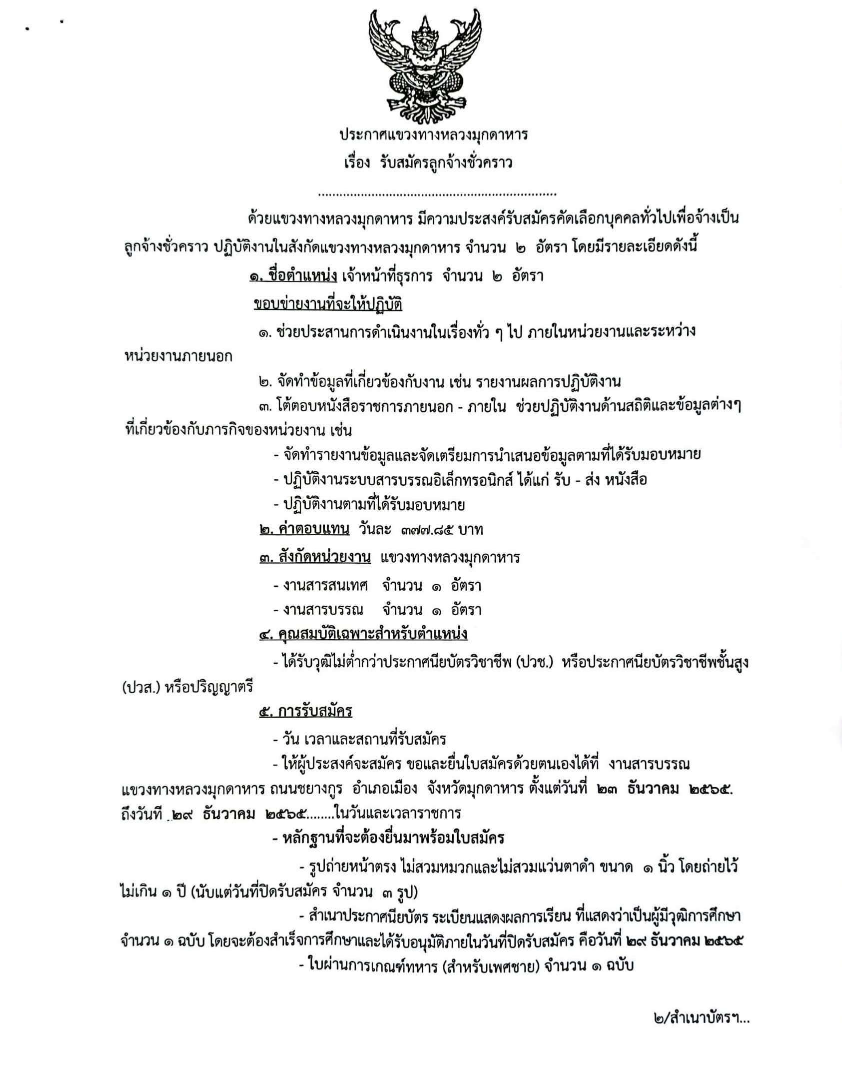 ด้วย แขวงทางหลวงมุกดาหาร มีความประสงค์เปิดรับสมัครคัดเลือกบุคคลทั่วไปเพื่อจัดจ้างเป็นลูกจ้างชั่วคราว ในสังกัดแขวงทางหลวงมุกดาหาร ตำแหน่ง เจ้าหน้าที่ธุรการ จำนวน 2 อัตรา