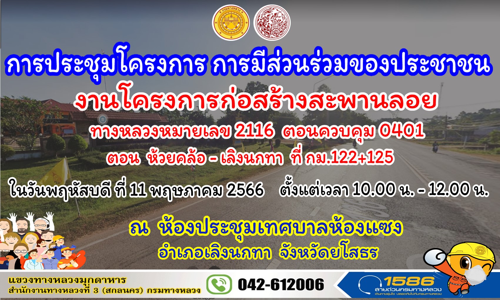 นายเกรียงศักดิ์ ตันปิยะกุล ผู้อำนวยการแขวงทางหลวงมุกดาหาร มอบหมายให้ นายประสันตา สุพร รองผู้อำนวยการแขวงทางหลวงมุกดาหาร (ฝ่ายวิศวกรรม), นายเดชา สายบุตร วิศวกรโยธาชำนาญการ, นายสมคิด ศรพรม หัวหน้าหมวดทางหลวงเลิงนกทา และนางวลานันท์ เมืองโคตร เจ้าพนักงานพัสดุชำนาญงาน พร้อมเจ้าหน้าที่แขวงทางหลวงมุกดาหาร เข้าร่วมประชุมการมีส่วนร่วมของประชาชน ชี้แจง และรับฟังความคิดเห็นของประชาชน โครงการก่อสร้างสะพานลอยคนเดินข้าม ในทางหลวงหมายเลข 2116 ตอนควบคุม 0401 ตอน ห้วยคล้อ - เลิงนกทา ที่ กม. 122+200 ณ ห้องประชุมเทศบาลตำบลห้องแซง โดยมี นายอำเภอเลิงนกทา/ ผู้กำกับการสถานีตำรวจภูธรเลิงนกทา/ นายกเทศมนตรีตำบลห้องแซง หน่วยงานราชการและผู้นำท้องถิ่น เข้าร่วมประชุม