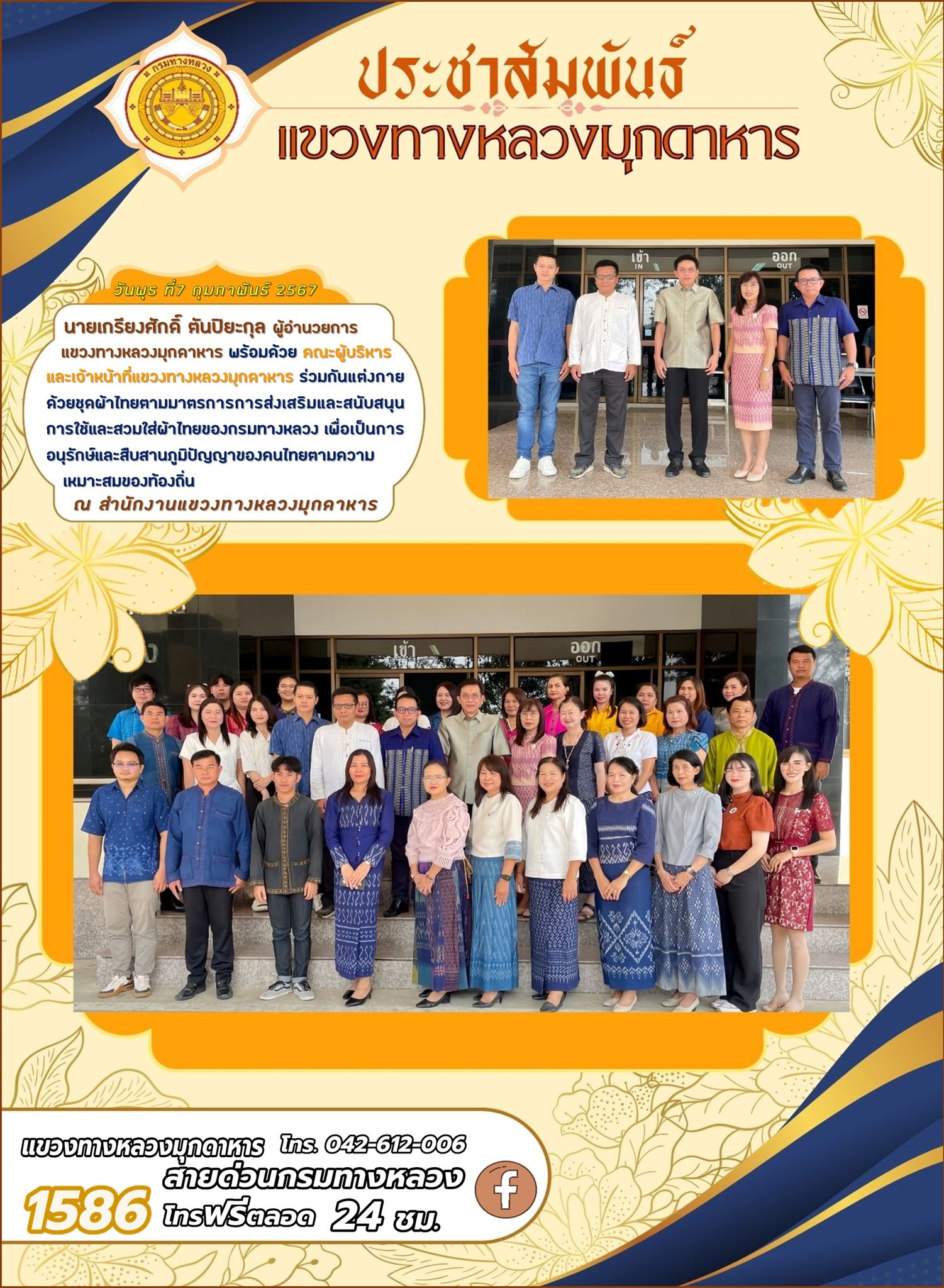 นายเกรียงศักดิ์ ตันปิยะกุล ผู้อำนวยการแขวงทางหลวงมุกดาหาร พร้อมด้วย คณะผู้บริหาร และเจ้าหน้าที่แขวงทางหลวงมุกดาหาร ร่วมกันแต่งกายด้วยชุดผ้าไทยตามมาตรการการส่งเสริม และสนับสนุนการใช้และสวมใส่ผ้าไทยของกรมทางหลวง เพื่อเป็นการอนุรักษ์และสืบสานภูมิปัญญาของคนไทยตามความเหมาะสมของท้องถิ่น ณ สำนักงานแขวงทางหลวงมุกดาหาร