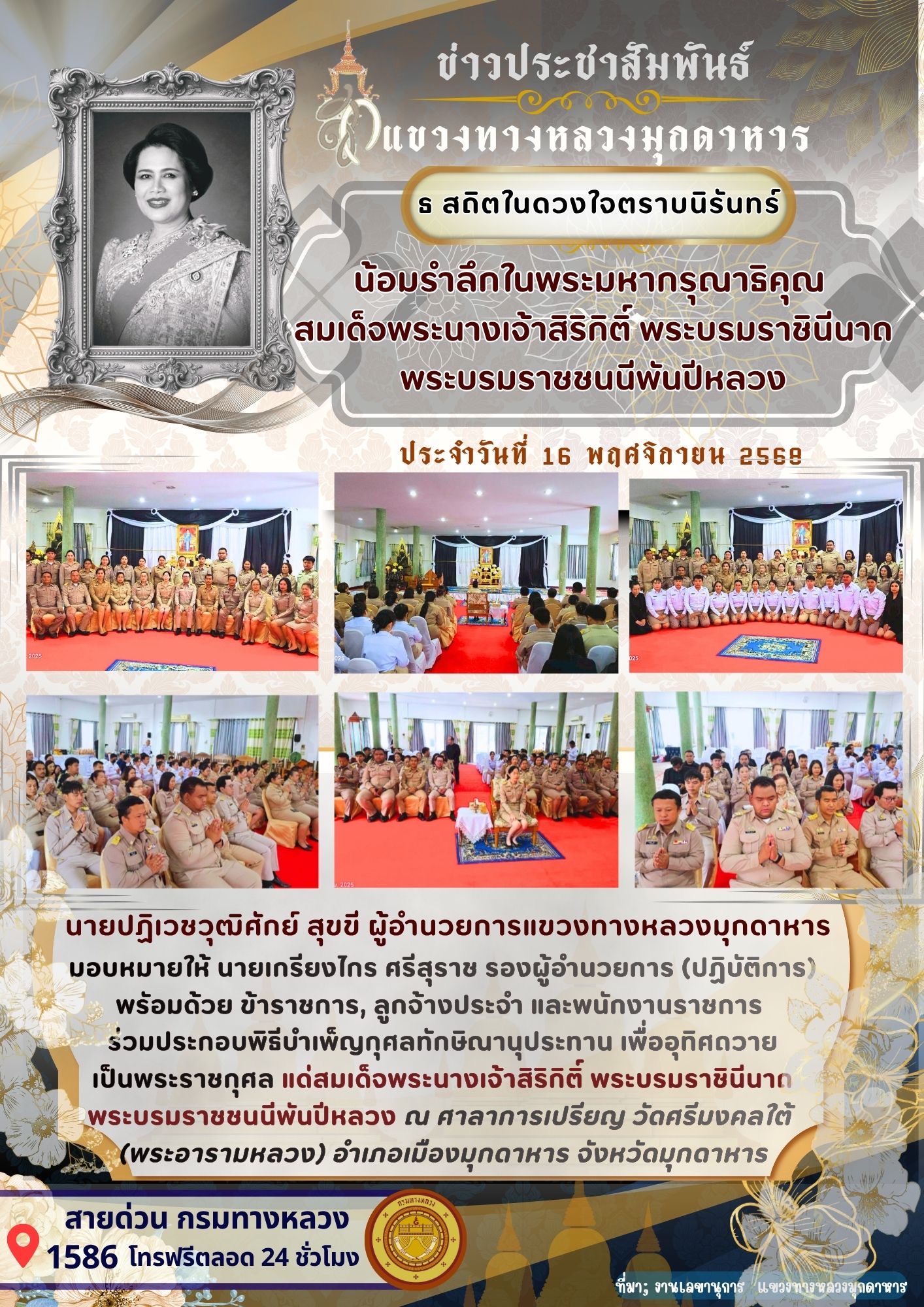 นายปฏิเวชวุฒิศักย์ สุขขี ผู้อำนวยการแขวงทางหลวงมุกดาหาร มอบหมายให้ นายเกรียงไกร ศรีสุราช รองผู้อำนวยการ (ปฏิบัติการ) พร้อมด้วย ข้าราชการ, ลูกจ้างประจำ และพนักงานราชการ ร่วมประกอบพิธีบำเพ็ญกุศลทักษิณานุประทาน เพื่ออุทิศถวายเป็นพระราชกุศล แด่สมเด็จพระนางเจ้าสิริกิติ์ พระบรมราชินีนาถ พระบรมราชชนนีพันปีหลวง ณ ศาลาการเปรียญ วัดศรีมงคลใต้ (พระอารามหลวง) อำเภอเมืองมุกดาหาร จังหวัดมุกดาหาร