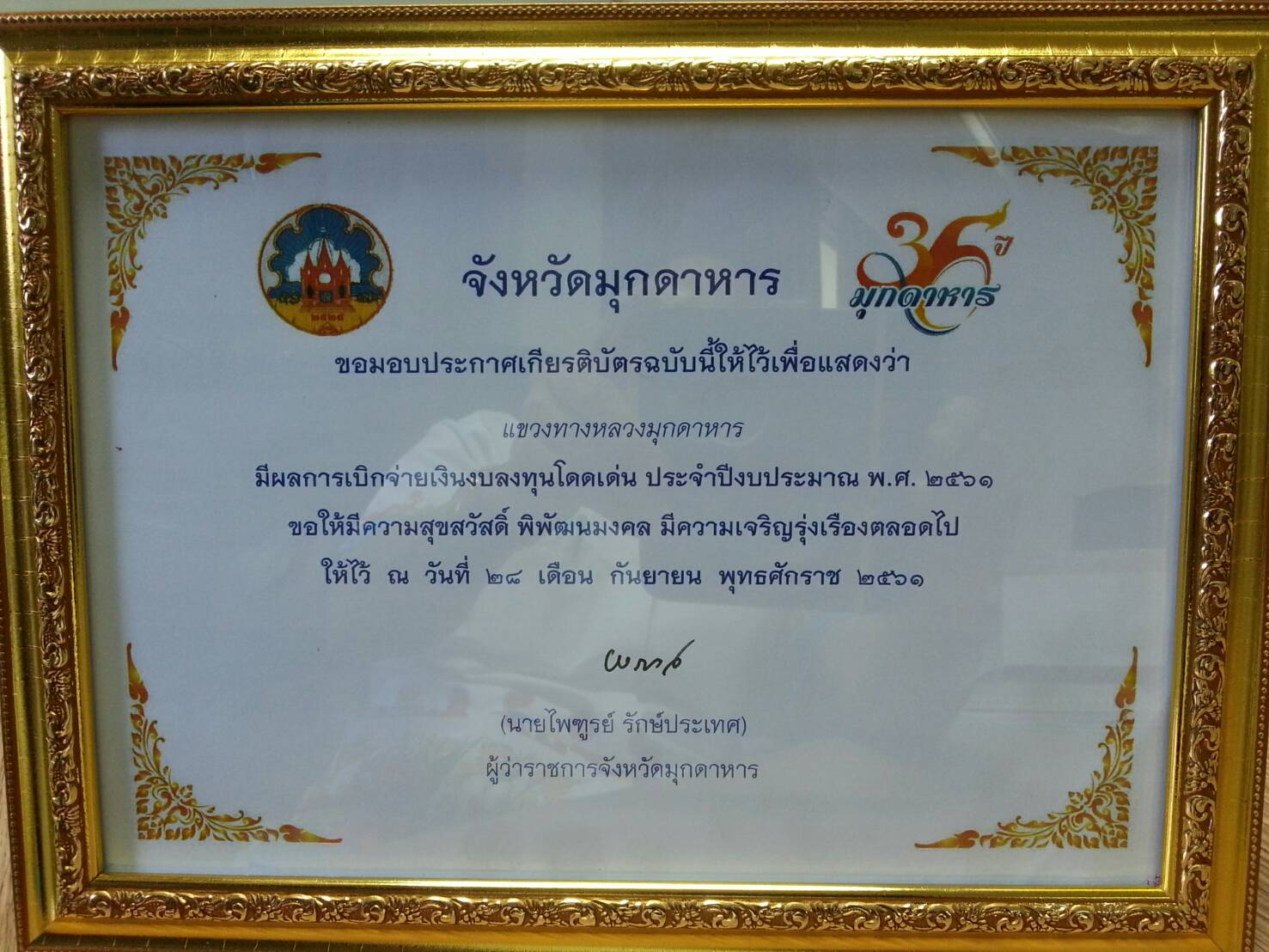 วันที่ 28 ก.ย.61 เวลา 09.30 น. นายอนน บุญกระสาน รองผู้อำนวยการแขวงทางหลวงมุกดาหาร ฝ่ายบริหารงานทั่วไปได้รับมอบหมายจาก ผู้อำนวยการแขวงทางหลวงมุกดาหาร. ให้เข้าร่วมประชุมกรมการจังหวัดและหัวหน้าส่วนราชการ และได้เข้ารับมอบใบประกาศเกียรติบัตรสำหรับส่วนราชการที่มีผลการเบิกจ่ายงบลงทุนโดดเด่น จาก นายไพฑูรย์ รักษ์ประเทศ ผู้ว่าราชการจังหวัดมุกดาหาร ณ ห้องประชุมแก้วกินรี ชั้น 5 ศาลากลางจังหวัดมุกดาหาร