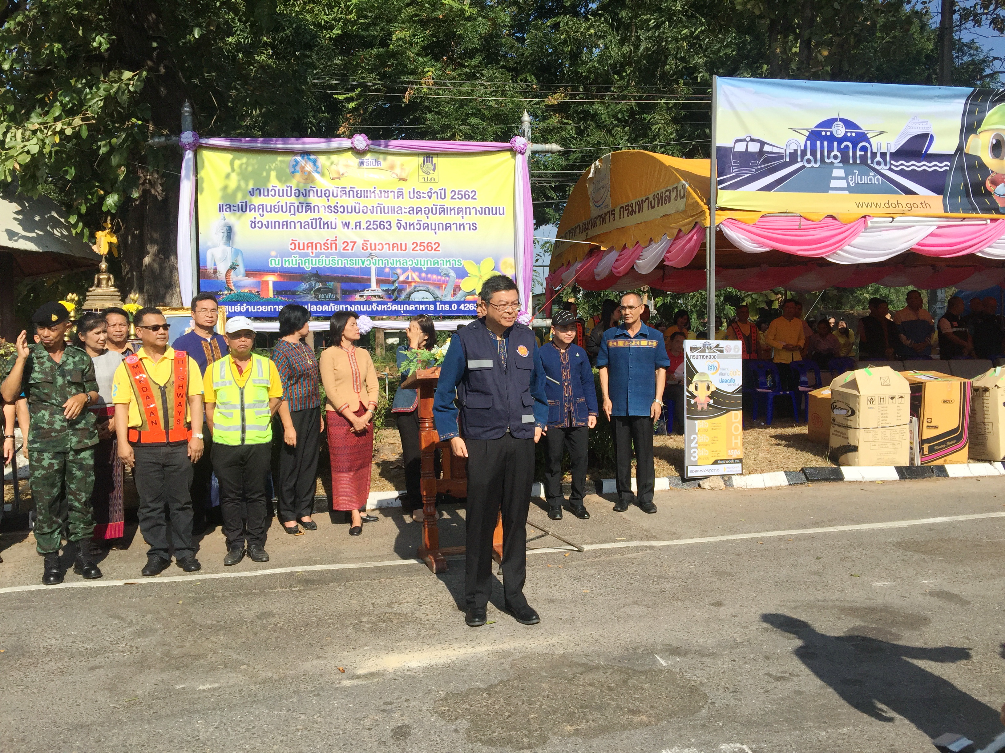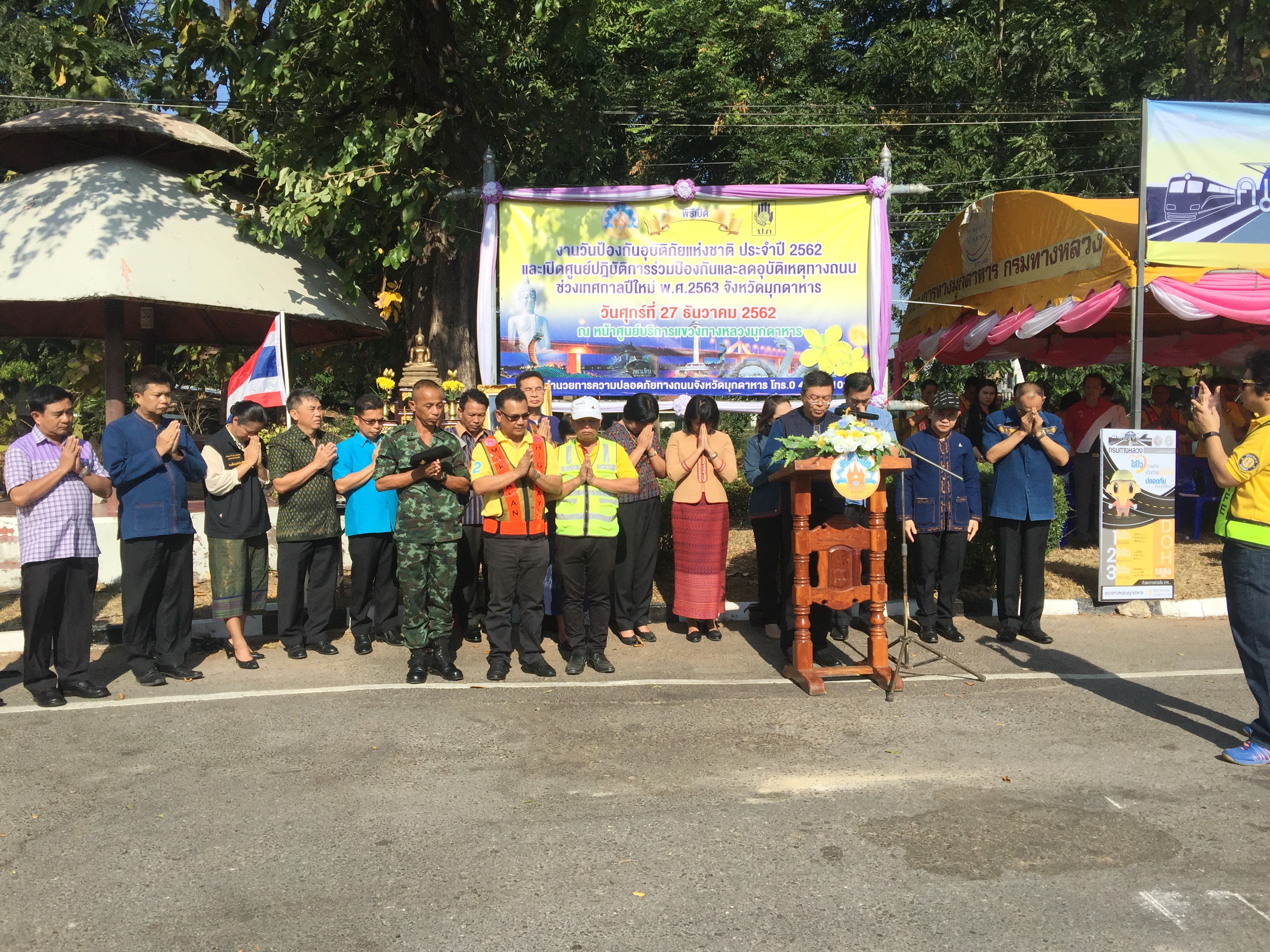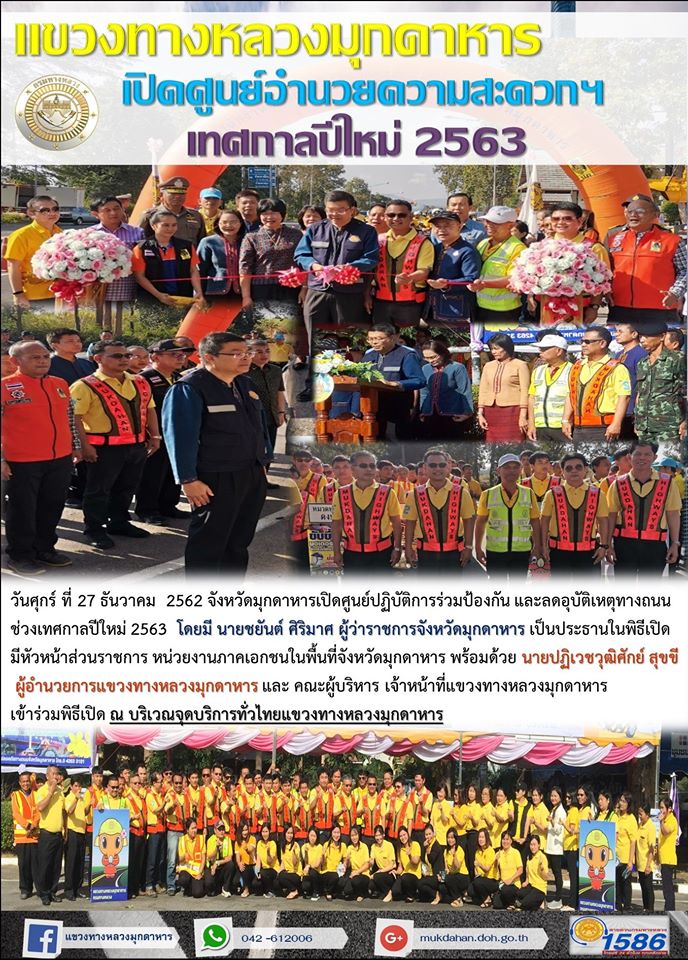 วันศุกร์ ที่ 27 ธันวาคม 2562 จังหวัดมุกดาหารเปิดศูนย์ปฏิบัติการร่วมป้องกัน และลดอุบัติเหตุทางถนน ช่วงเทศกาลปีใหม่ 2563 โดยมี นายชยันต์ ศิริมาศ ผู้ว่าราชการจังหวัดมุกดาหาร เป็นประธานในพิธีเปิด มีหัวหน้าส่วนราชการ หน่วยงานภาคเอกชนในพื้นที่จังหวัดมุกดาหาร พร้อมด้วย นายปฏิเวชวุฒิศักย์ สุขขี ผู้อำนวยการแขวงทางหลวงมุกดาหาร และ คณะผู้บริหาร เจ้าหน้าที่แขวงทางหลวงมุกดาหาร เข้าร่วมพิธีเปิด ณ บริเวณจุดบริการทั่วไทยแขวงทางหลวงมุกดาหาร