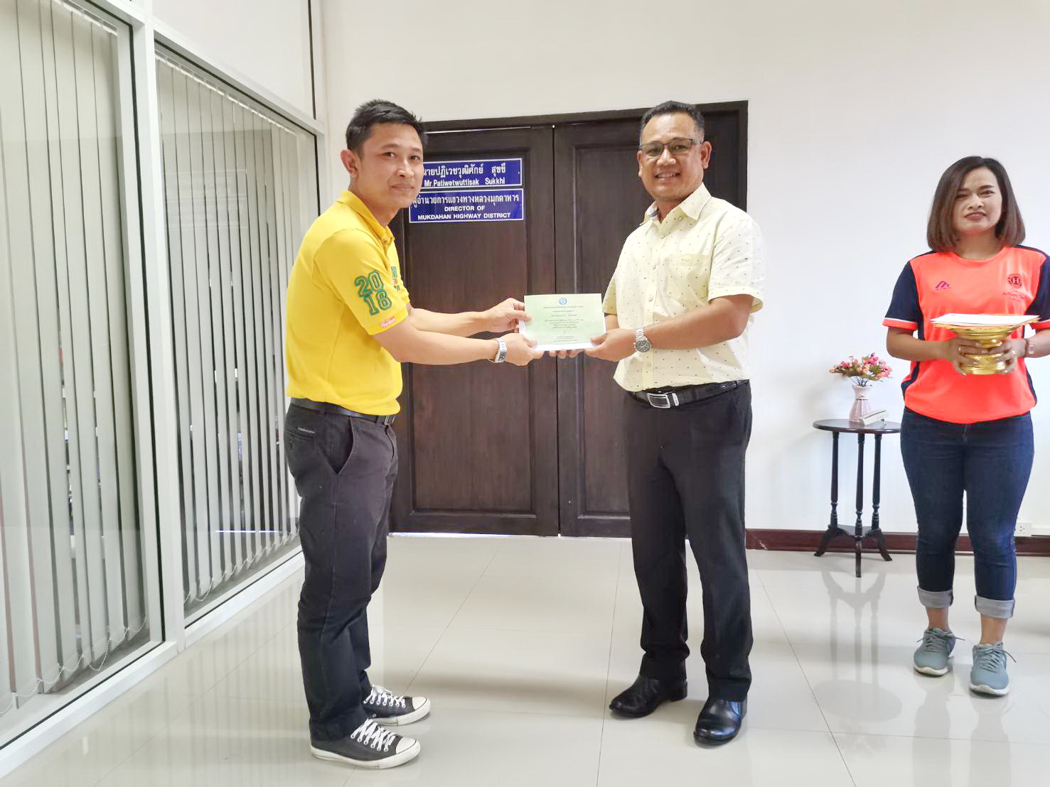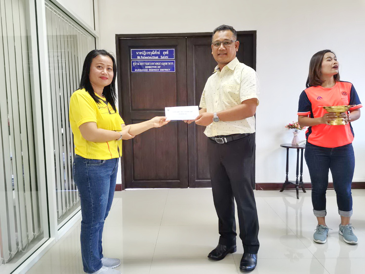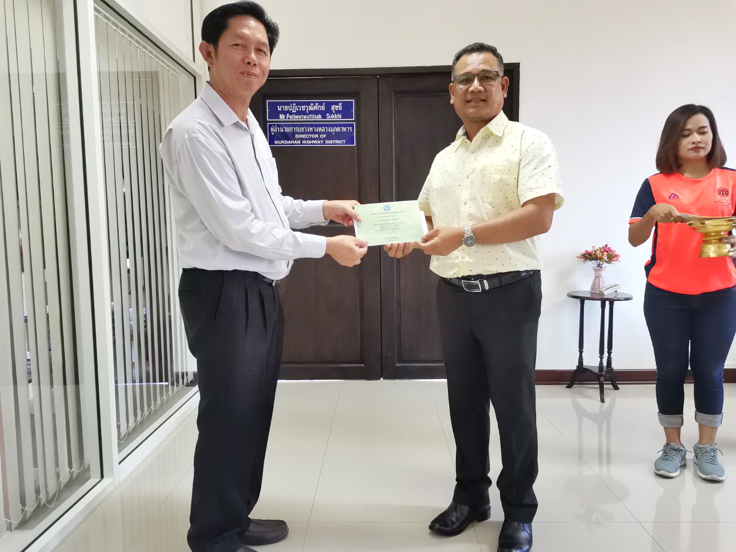 วันพฤหัสบดี ที่ 9 มกราคม 2563 นายปฏิเวชวุฒิศักย์ สุขขี ผู้อำนวยการแขวงทางหลวงมุกดาหาร มอบเงินทุนส่งเสริมการศึกษาบุตรสมาชิกสหกรณ์ออมทรัพย์ กรมทางหลวง ประเภททุนเรียนดี ประจำปี 2562 ณ แขวงทางหลวงมุกดาหาร