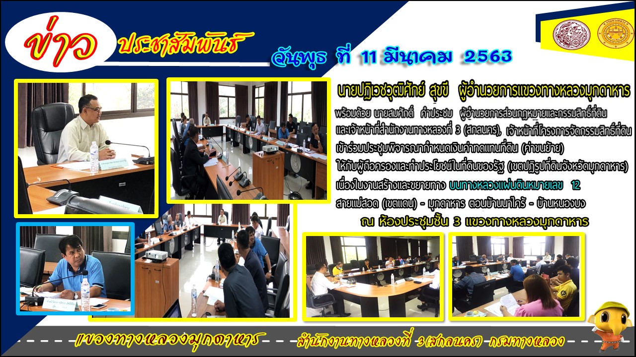 โดยนายปฏิเวชวุฒิศักดิ์? สุขขี ผู้อำนวยการแขวงทางหลวง?มุกดาหาร? พร้อมด้วย นายสมศักดิ์ คำประชม ผู้อำนวยการส่วนกฎหมายและกรรมสิทธิ์ที่ดิน และเจ้าหน้าที่สำนักงาน?ทางหลวง?ที่? 3? (สกลนคร)? , เจ้าหน้าที่โครงการจัดกรรมสิทธิ์?ที่ดิน ได้เข้าร่วมประชุมพิจารณากำหนดเงินค่าทดแทนที่ดิน (ค่าขนย้าย) ให้กับผู้ถือครองและทำประโยชน์ในที่ดินของรัฐ (เขตปฏิรูปที่ดินจังหวัดมุกดาหาร) เนื่องในงานสร้างและขยายทางหลวง?แผ่นดิน?หมายเลข? 12? สายแม่?สอด?(เขตแดน)? -? มุกดาหาร? ตอนบ้านน