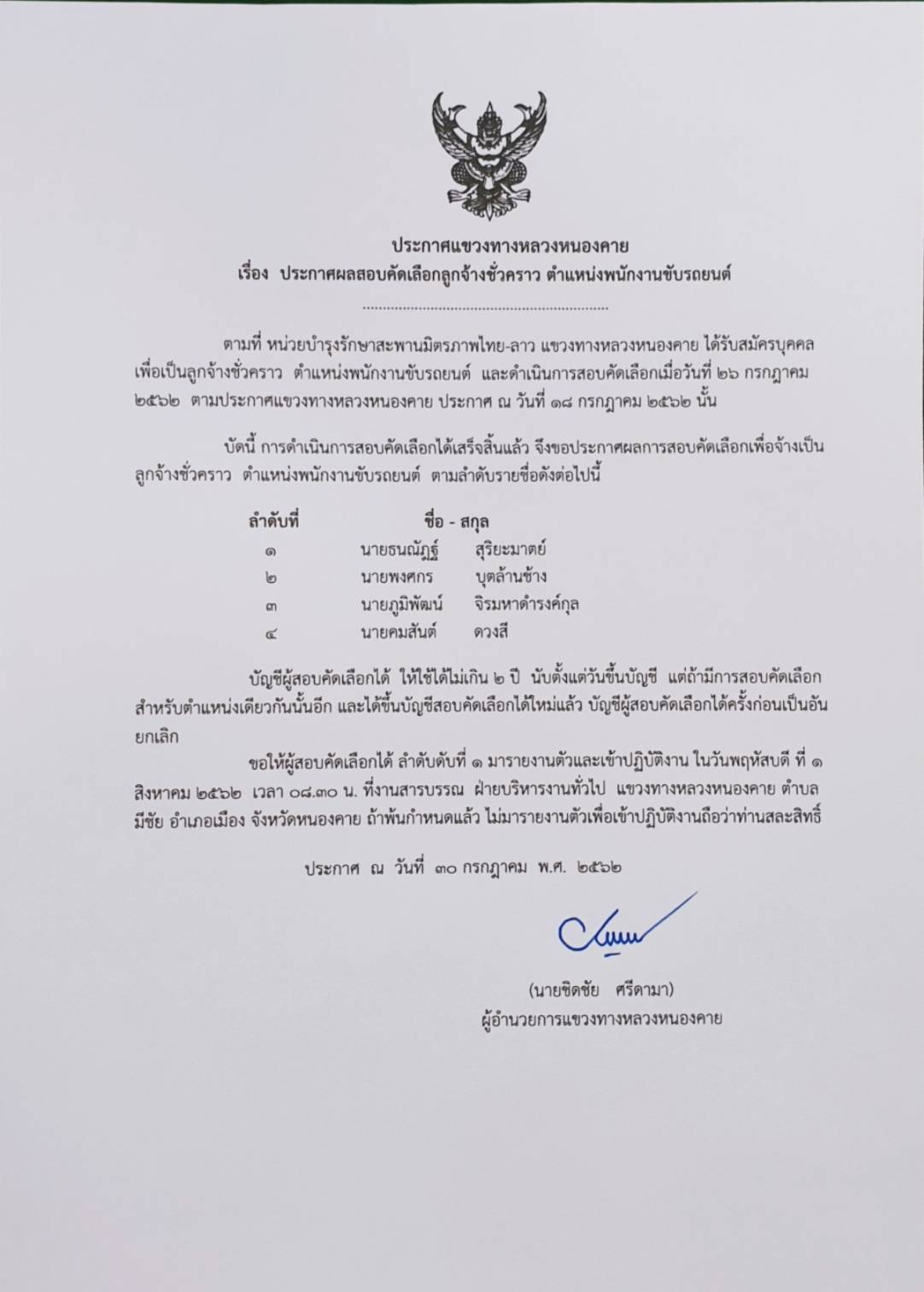 ข้อมูลประกาศรับสมัครพนักงานราชการ : ประกาศผลสอบคัดเลือกลูกจ้างชั่วคราว ตำแหน่งพนักงานขับรถยนต์
