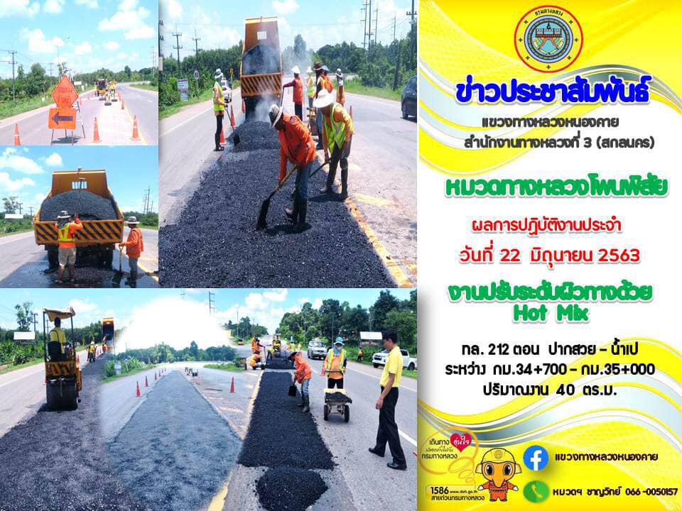 รายงานผลการปฏิบัติงาน แขวงทางหลวงหนองคาย วันที่ 22 มิถุนายน 2563 โดย หมวดทางหลวงโพนพิสัย งานปรับระดับผิวทางด้วย Hot Mix ,งานซ่อมศาลาที่พักผู้โดยสาร ทางหลวงหมายเลข 212 #สำนักงานทางหลวงที่3สกลนคร #กรมทางหลวง #แขวงทางหลวงหนองคาย