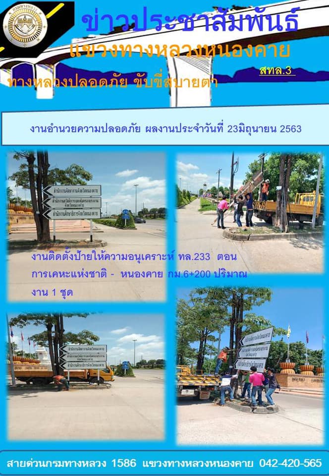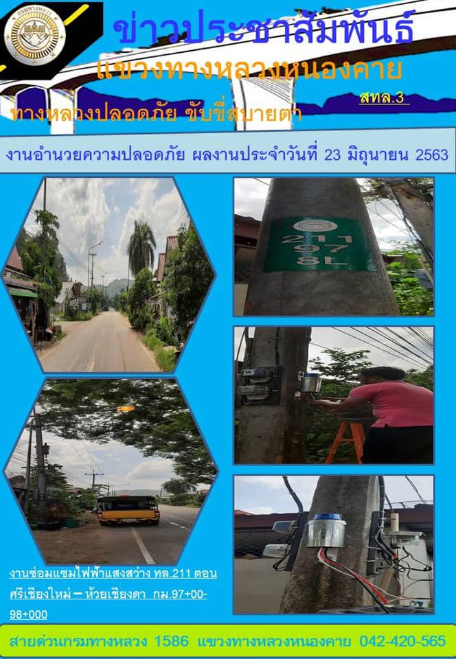 รายงานผลการปฏิบัติงาน แขวงทางหลวงหนองคาย วันที่ 23 มิถุนายน 2563 โดย งานอำนวยความปลอดภัย งานซ่อมแซมไฟฟ้าแสงสว่าง ทางหลวงหมายเลข 211 , งานซ่อมแซมไฟฟ้า High Mast , งานติดตั้งป้ายให้ความอนุเคราะห์ ทางหลวงหมายเลข 233 #สำนักงานทางหลวงที่3สกลนคร #กรมทางหลวง #แขวงทางหลวงหนองคาย