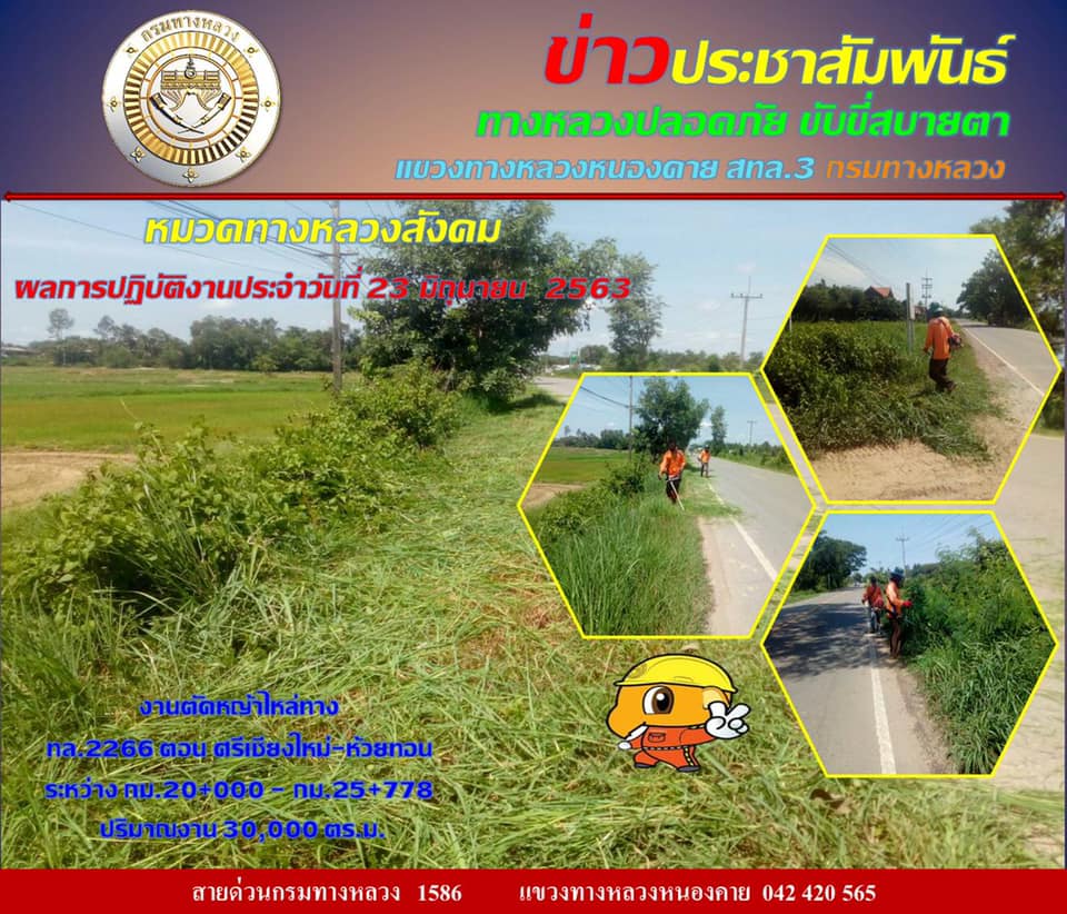รายงานผลการปฏิบัติงาน แขวงทางหลวงหนองคาย วันที่ 23 มิถุนายน 2563 โดย หมวดทางหลวงสังคม งานตัดหญ้าไหล่ทาง ทางหลวงหมายเลข 2266#สำนักงานทางหลวงที่3สกลนคร #กรมทางหลวง #แขวงทางหลวงหนองคาย