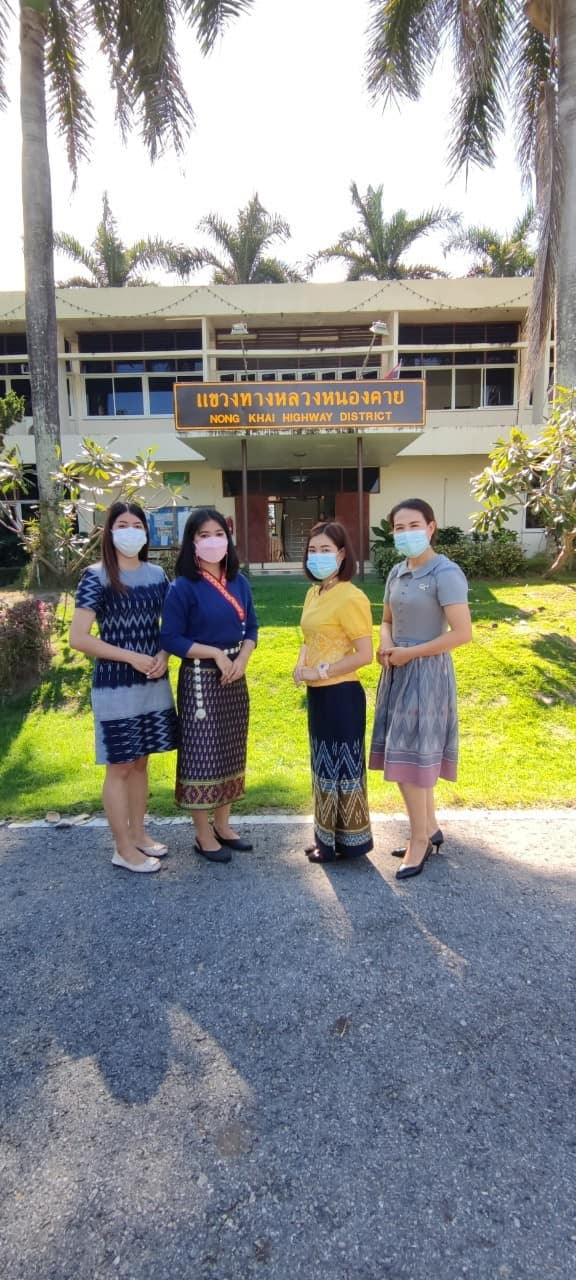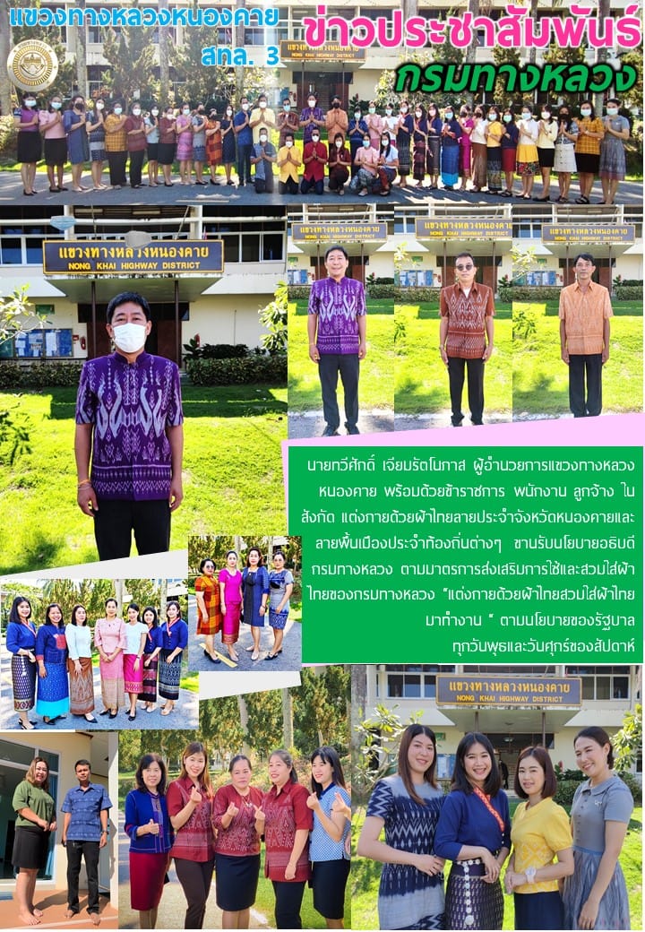 นายทวีศักดิ์ เจียมรัตโนภาส ผู้อำนวยการแขวงทางหลวงหนองคาย พร้อมด้วยข้าราชการ พนักงาน ลูกจ้าง ในสังกัด แต่งกายด้วยผ้าไทยลายประจำจังหวัดหนองคายและลายพื้นเมืองประจำท้องถิ่น ขานรับนโยบายอธิบดีกรมทางหลวง ตามมาตรการส่งเสริมการใช้และสวมใส่ผ้าไทยของกรมทางหลวง “แต่งกายด้วยผ้าไทยสวมใส่ผ้าไทยมาทำงาน “ ตามนโยบายของรัฐบาล
