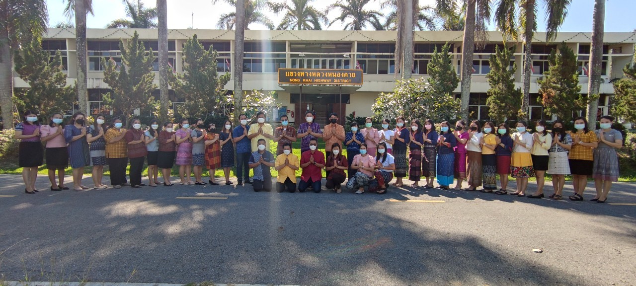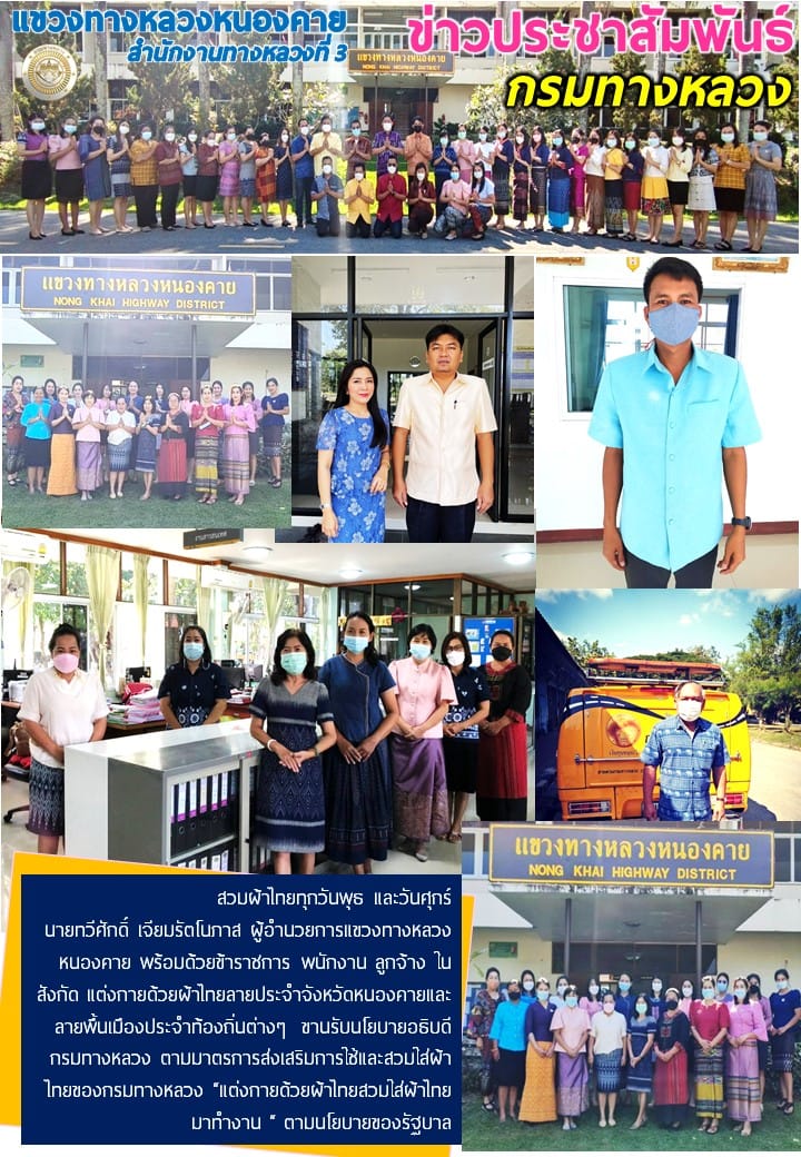 นายทวีศักดิ์ เจียมรัตโนภาส ผู้อำนวยการแขวงทางหลวงหนองคาย พร้อมด้วยข้าราชการ พนักงาน ลูกจ้าง ในสังกัด แต่งกายด้วยผ้าไทยลายประจำจังหวัดหนองคายและลายพื้นเมืองประจำท้องถิ่นต่างๆ ขานรับนโยบายอธิบดีกรมทางหลวง ตามมาตรการส่งเสริมการใช้และสวมใส่ผ้าไทยของกรมทางหลวง “แต่งกายด้วยผ้าไทยสวมใส่ผ้าไทยมาทำงาน “ ตามนโยบายของรัฐบาล