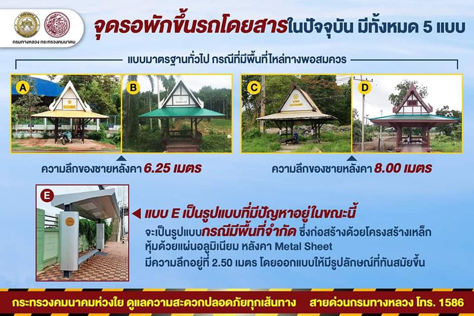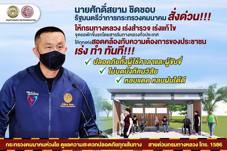 ประชาสัมพันธ์ นายศักดิ์สยาม ชิดชอบ รัฐมนตรีว่าการกระทรวงคมนาคม สั่งด่วน !!! ให้กรมทางหลวง เร่งสำรวจ เร่งแก้ไข จุดรอพักขึ้นรถโดยสารริมทางหลวงทั่วประเทศ แขวงทางหลวงหนองคาย 042 420565 กรมทางหลวง กระทรวงคมนาคม สายด่วนกรมทางหลวง1586 โทรฟรีทุกเครือข่ายตลอด ชั่วโมง