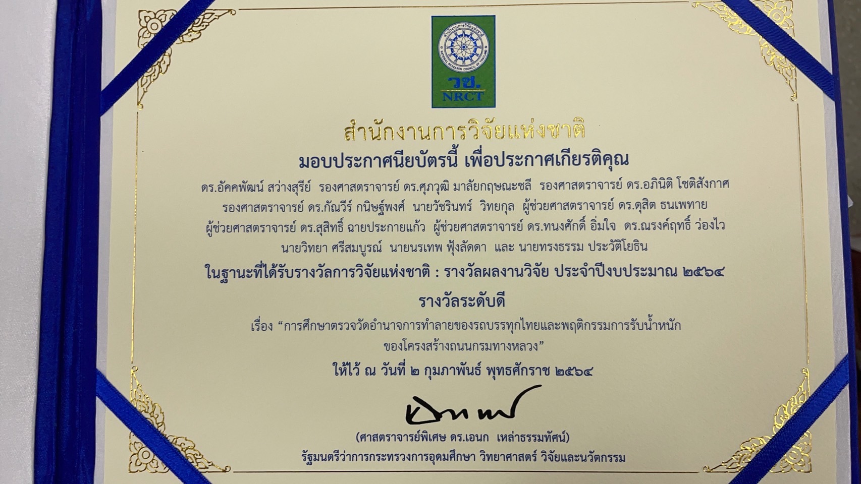 กรมทางหลวงรับรางวัลผลงานวิจัยจากสำนักงานการวิจัยแห่งชาติ รางวัล GRAA จากสมาพันธ์ทางหลวงนานาชาติ (IRF) และรางวัล Mino Best Project Award จากสมาคมวิศวกรรมงานทางแห่งเอเชียและออสตราเลเซีย (REAAA) ประจำปี พ.ศ. 2564