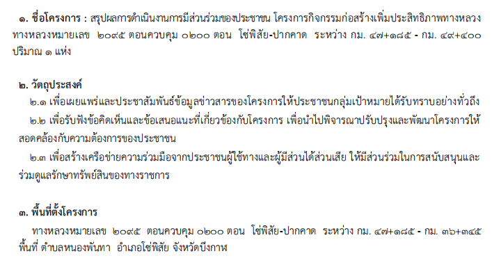 วันที่ 17 ธันวาคม 2568 เวลา 08.30 น. ณ หอประชุมโรงเรียนบ้านห้วยลึก อำเภอโซ่พิสัย จังหวัดบึงกาฬ นายมนูญ ชูตรี ผู้อำนวยการแขวงทางหลวงหนองคาย กำหนดจัดประชุมโครงการการมีส่วนร่วมของประชาชนประจำปีงบประมาณ 2569 โครงการก่อสร้างบริเวณทางหลวงหมายเลข 2095 ตอน โซ่พิสัย-ปากคาด ระหว่าง กม. 47+ 185 - กม. 49+ 400