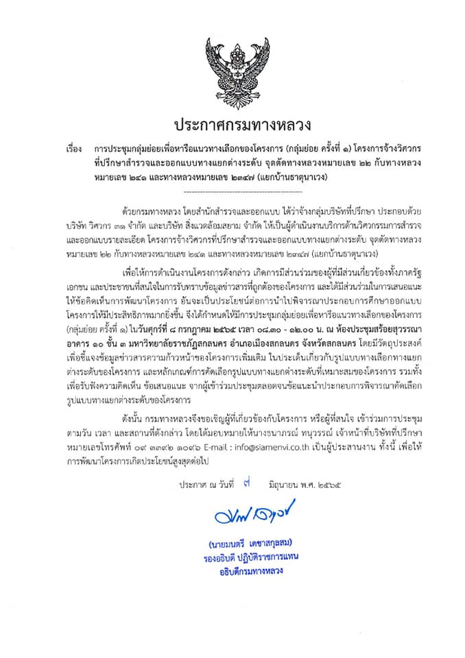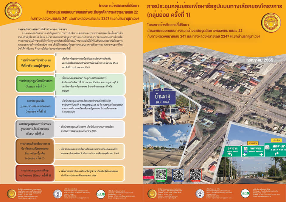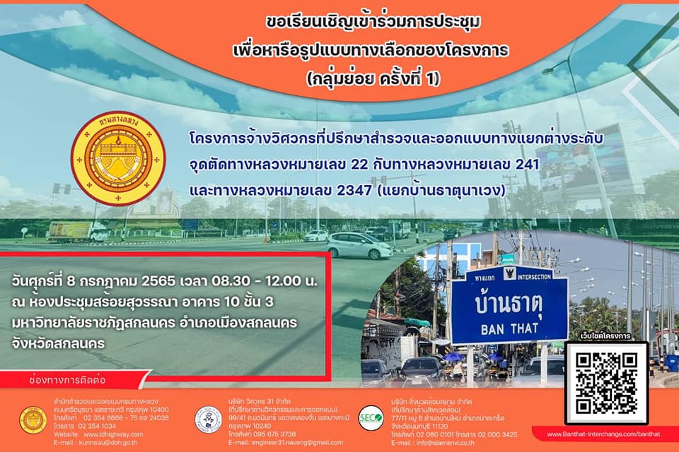 ขอเรียนเชิญเข้าร่วมการประชุมเพื่อหารือรูปแบบทางเลือกของโครงการจ้างวิศวกรที่ปรึกษาสำรวจแลออกแบบทางแยกต่างระดับจุดตัดทางหลวงหมายเลข 22 กับทางหลวงหมายเลข 241และทางหลวงหมายเลข 2347 (แยกบ้านธาตุนาเวง)