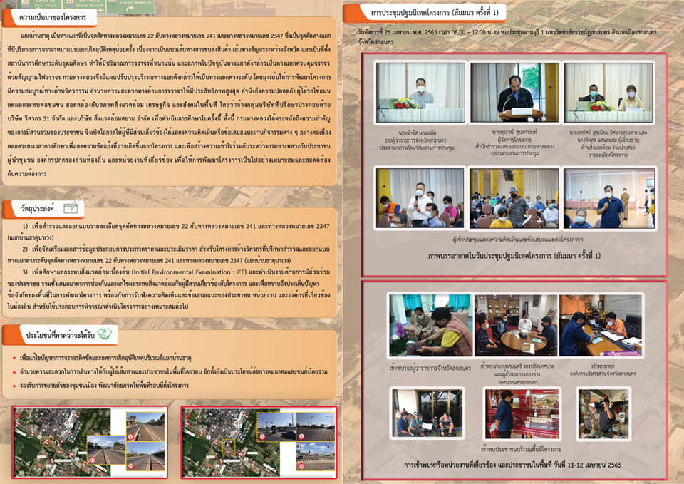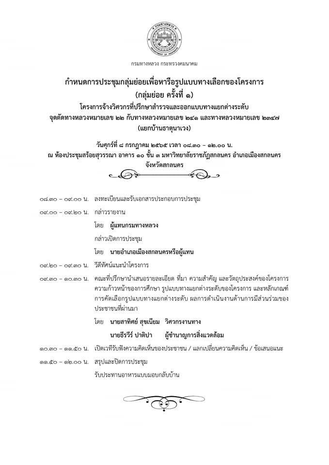 ขอเรียนเชิญเข้าร่วมการประชุมเพื่อหารือรูปแบบทางเลือกของโครงการจ้างวิศวกรที่ปรึกษาสำรวจแลออกแบบทางแยกต่างระดับจุดตัดทางหลวงหมายเลข 22 กับทางหลวงหมายเลข 241และทางหลวงหมายเลข 2347 (แยกบ้านธาตุนาเวง) วันศุกร์ที่ 8 กรกฎาคม 2565 เวลา 08.30 - 12.00 น.ณ ห้องประชุมสร้อยสุวรรณา อาคาร 10 ชั้น 3 มหาวิทยาลัยราชภัฎสกลนคร อำเภอเมืองสกลนคร