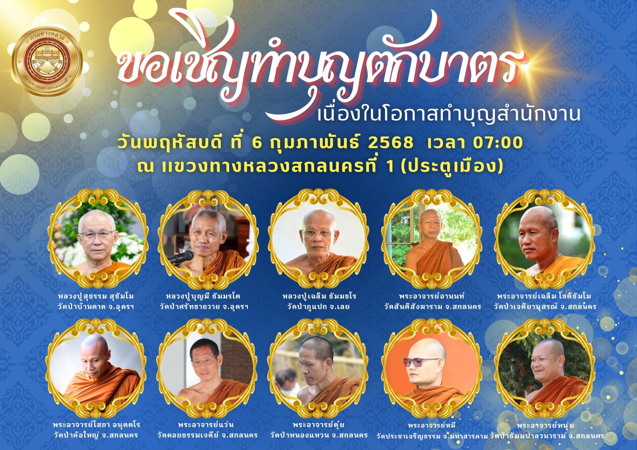 ขอเชิญร่วมใส่บาตรในโอกาสทำบุญสำนักงาน 6 กุมภาพันธ์ 2568 ณ สำนักงานเเขวงทางหลวงสกลนครที่ 1 (ประตูเมือง)