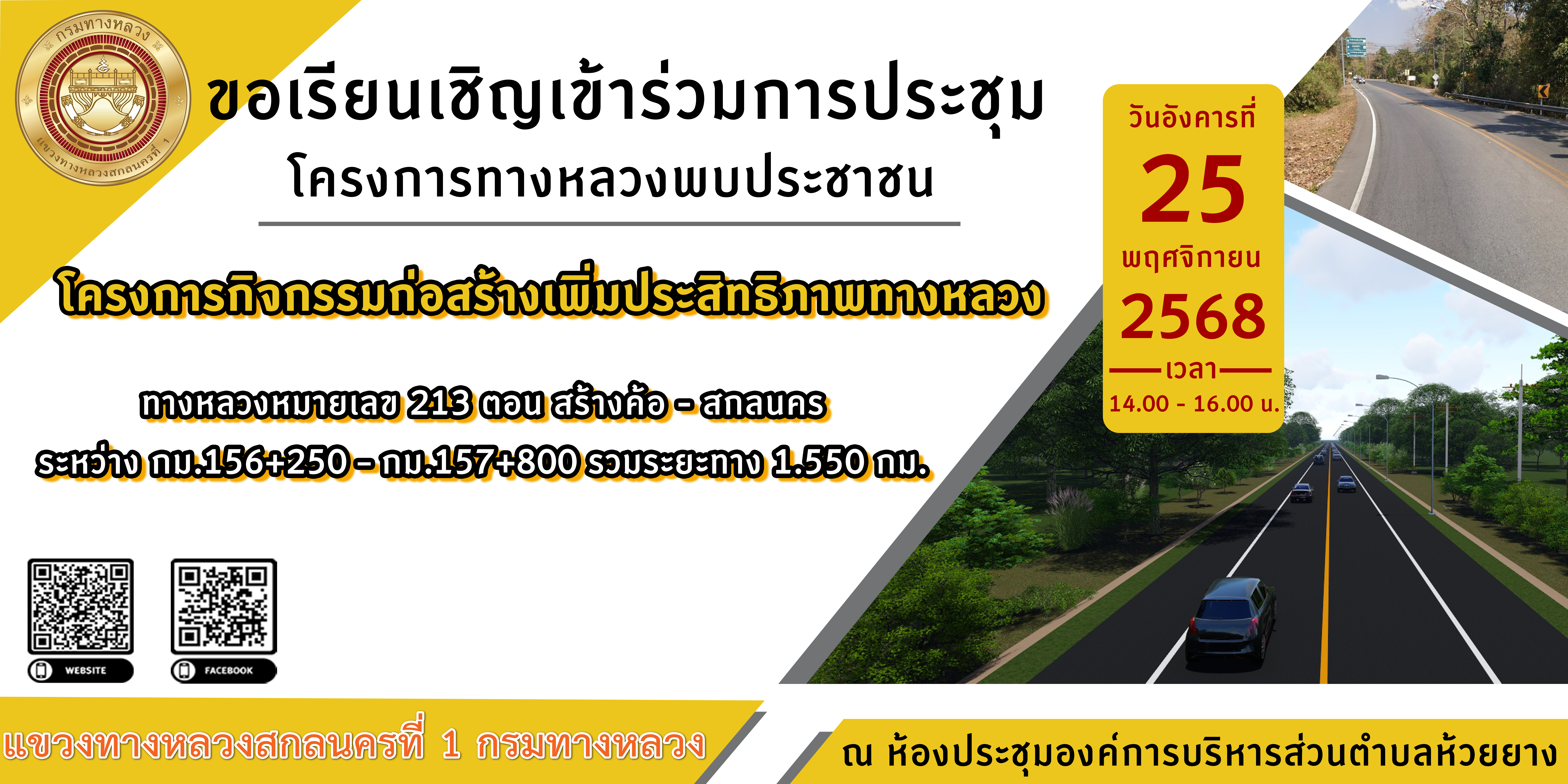 ขอเรียนเชิญเข้าร่วมการประชุมโครงการทางหลวงพบประชาชน โครงการกิจกรรมก่อสร้างเพิ่มประสิทธิภาพทางหลวง ทางหลวงหมายเลข 213 ตอน สร้างค้อ - สกลนคร ระหว่าง กม.156+250 - กม.157+800 รวมระยะทาง 1.550 กม. ณ ห้องประชุมองค์การบริหารตำบลห้วงยาง วันอังคารที่ 25 พฤศจิกายน 2568 เวลา 14.00น.