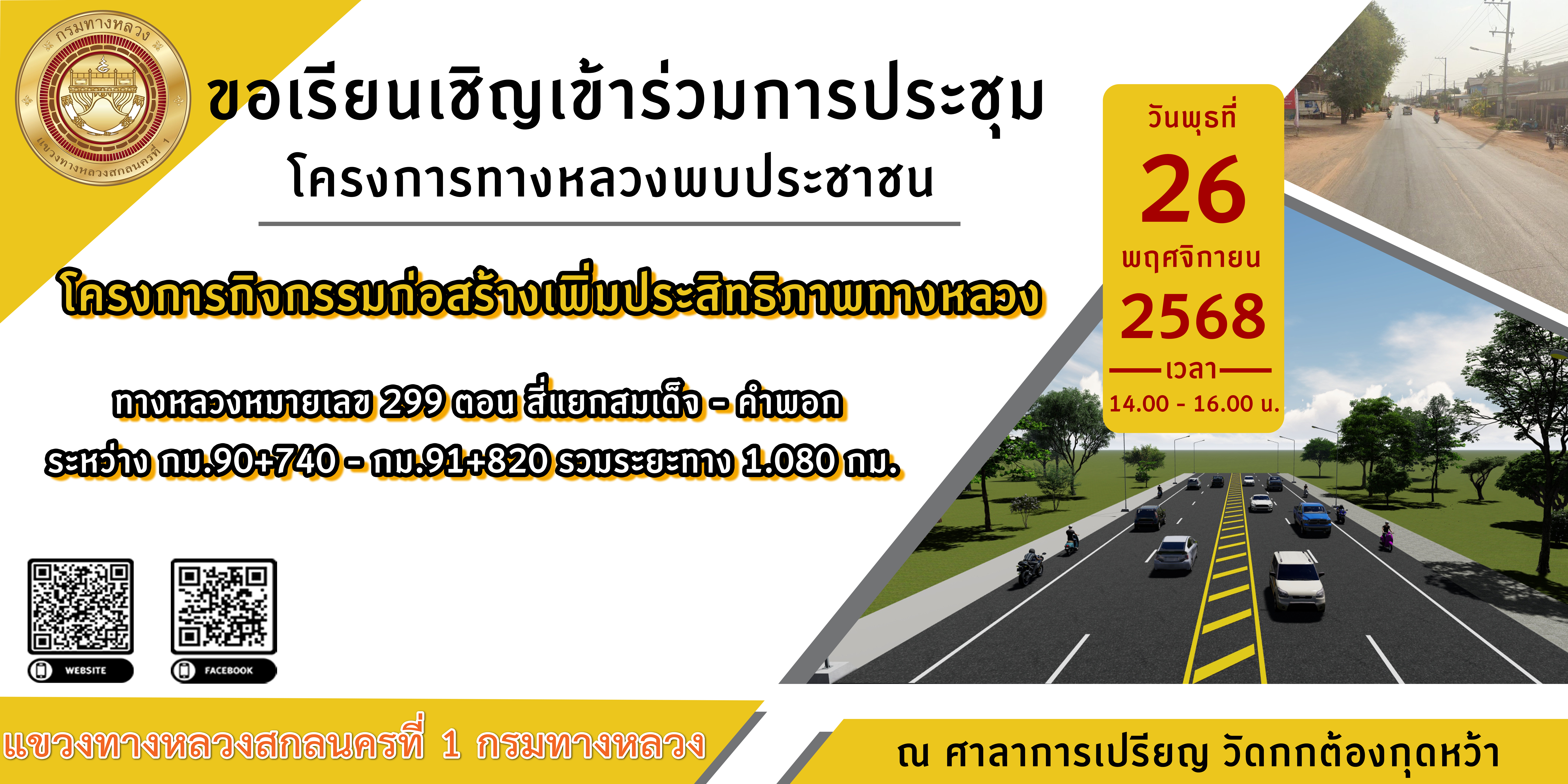 ขอเรียนเชิญเข้าร่วมการประชุมโครงการทางหลวงพบประชาชน โครงการกิจกรรมก่อสร้างเพิ่มประสิทธิภาพทางหลวง ทางหลวงหมายเลข 299 ตอน สี่แยกสมเด็จ - คำพอก ระหว่าง กม.90+740 - กม.91+820 รวมระยะทาง 1.080 กม. ศาลาการเปรียญ วัดกกต้องกุดหว้า วันพุธที่ 26 พฤศจิกายน 2568 เวลา 14.00.