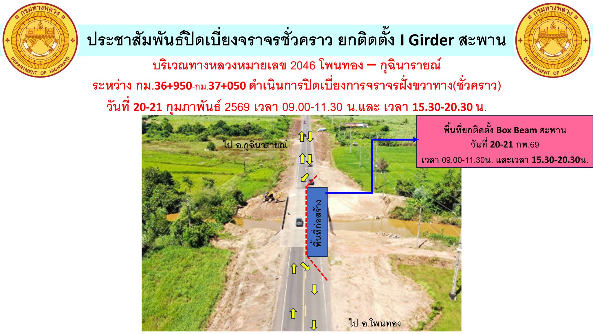 ประชาสัมพันธ์ปิดเบี่ยงจราจรชั่วคราว ยกติดตั้ง I Girder สะพาน บริเวณทางหลวงหมายเลข 2046 โพนทอง - กุฉินารายณ์ ระหว่าง กม.36+950-กม.37+050 ดำเนินการปิดเบียงการจราจรฝังขวาทาง(ชั่วคราว) วันที่ 20-21 กุมภาพันธ์ 2569 เวลา 09.00-11.30 น. และ เวลา 15.30-20.30 น.