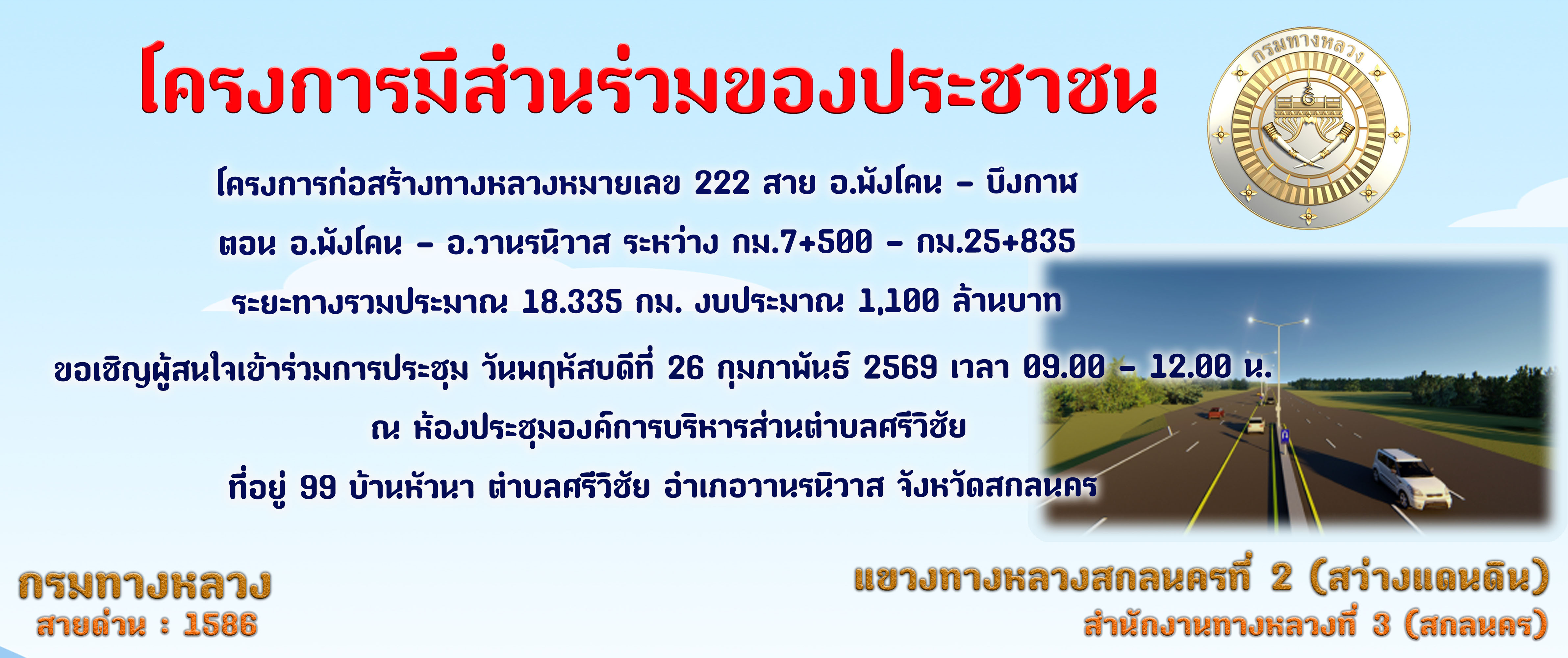 ขอเรียนเชิญเข้าร่วมการประชุมการมีส่วนร่วมของประชาชน โครงการก่อสร้างทางหลวงหมายเลข 222 สาย อ.พังโคน – บึงกาฬ ตอน อ.พังโคน - อ.วานรนิวาส ระหว่าง กม.7+500 - กม.25+835 ระยะทาง 18.335 กม. งบประมาณ 1,100 ล้านบาท ณ ห้องประชุมองค์การบริหารส่วนตำบลศรีวิชัย ที่อยู่ 99 บ้านหัวนา ตำบลศรีวิชัย อำเภอวานรนิวาส จังหวัดสกลนคร ในวันพฤหัสบดีที่ 26 กุมภาพันธ์ 2569 เวลา 09.00 - 12.00 น.